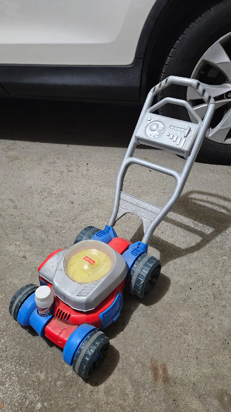 Fisher-Price Bubble Mower. It's in good condition and ready for some bubbly fun! This toy mower is perfect for toddlers who love to mimic grown-up yard work. Just add bubble solution (not included) and watch the bubbles fly as they push it around.