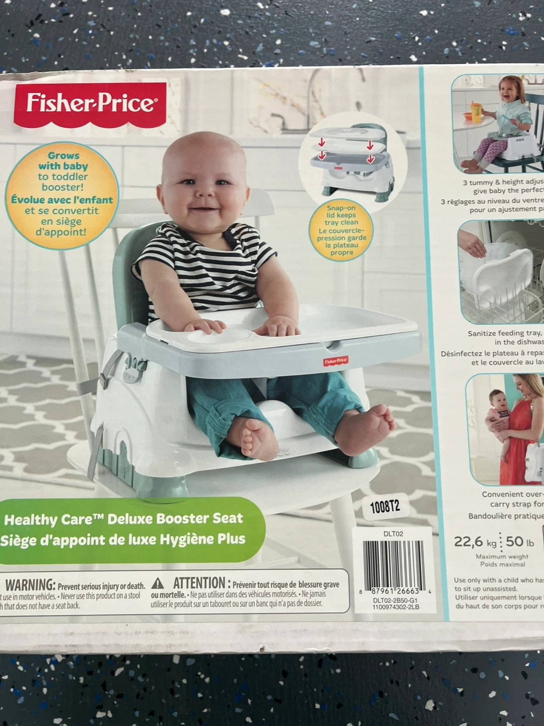10Selling a Fisher-Price Healthy Care Deluxe Booster Seat. It grows with your baby to toddler booster! It has a sanitizing feeding tray insert and lid that's dishwasher safe. The maximum weight it holds is 50 lb (22.6 kg). Comes with a convenient over-the-shoulder carry strap for take-along
