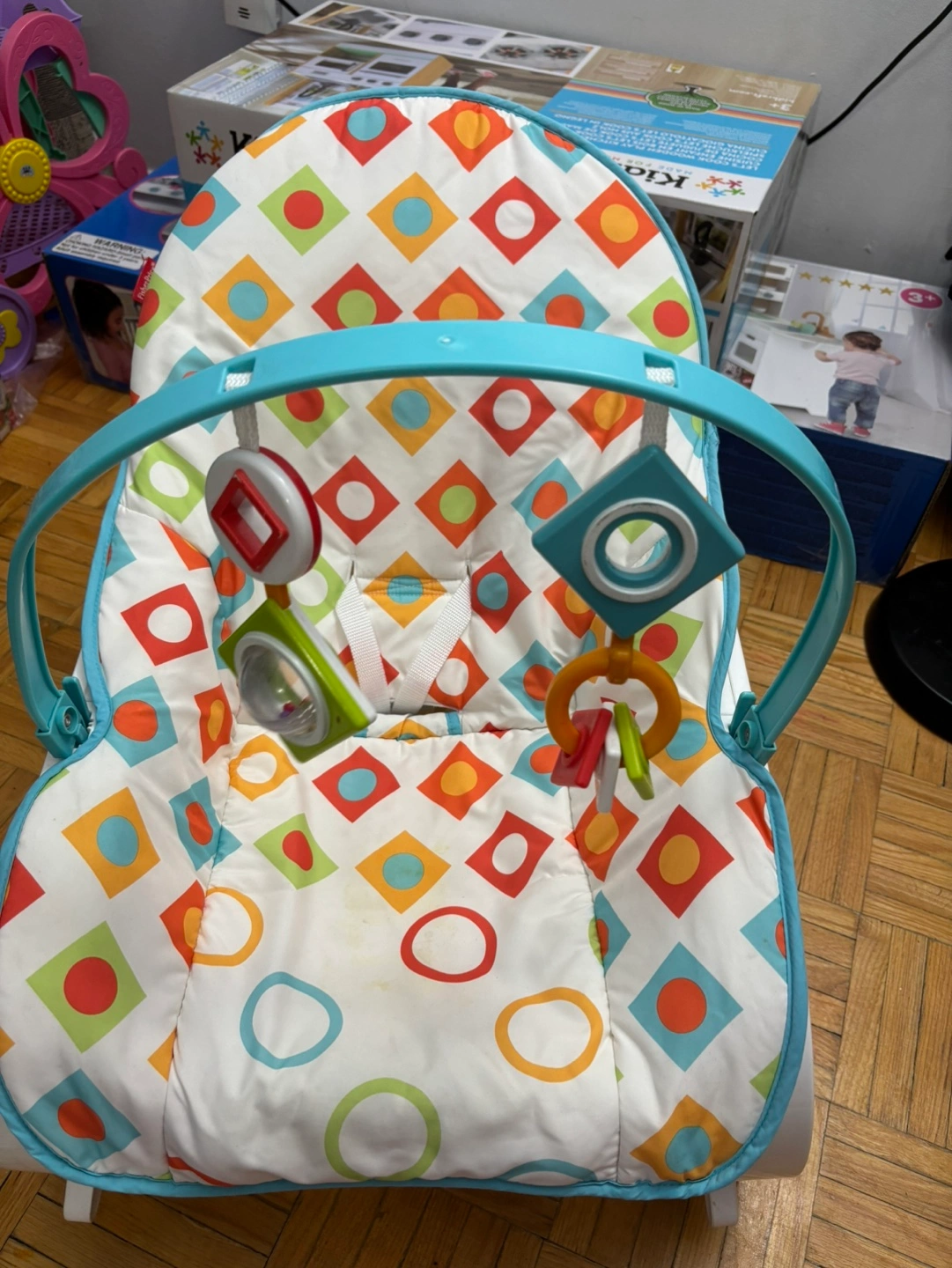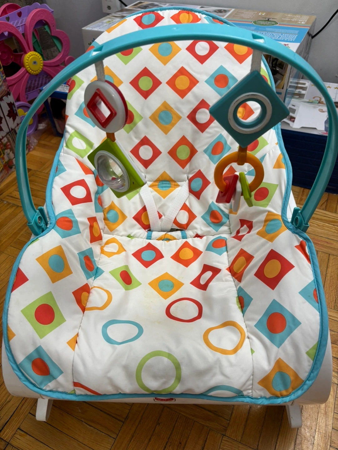 Gently used, infant to toddler rocker with multiple toys and a soft padded seat. Rocker is in good condition.