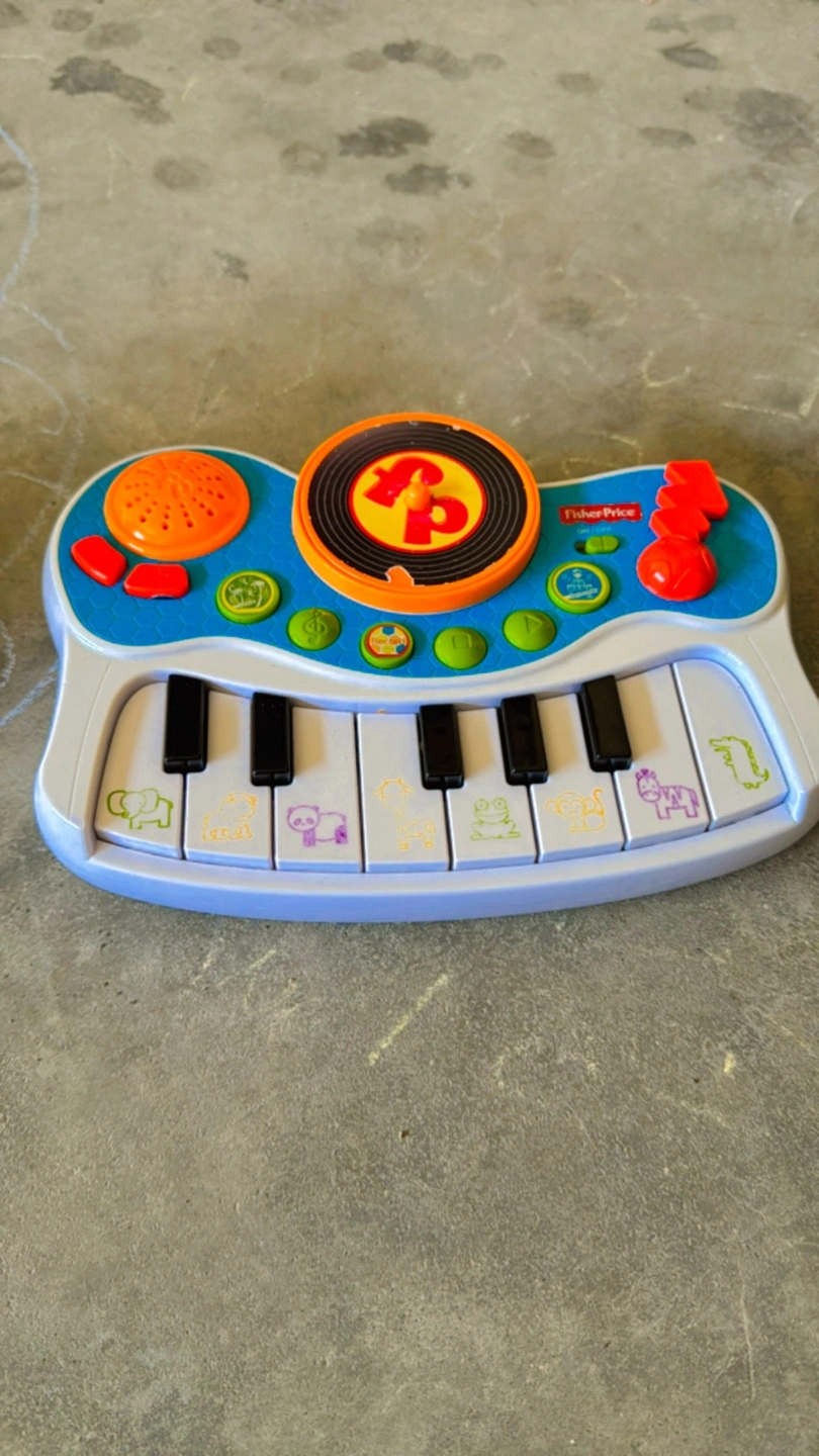 Musical keyboard toy. Features piano keys, spinning record, and various sound effects. Ideal for toddlers. Shows minor signs of wear.