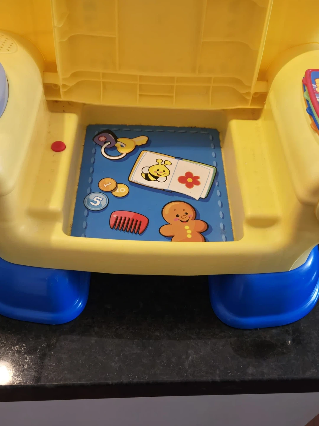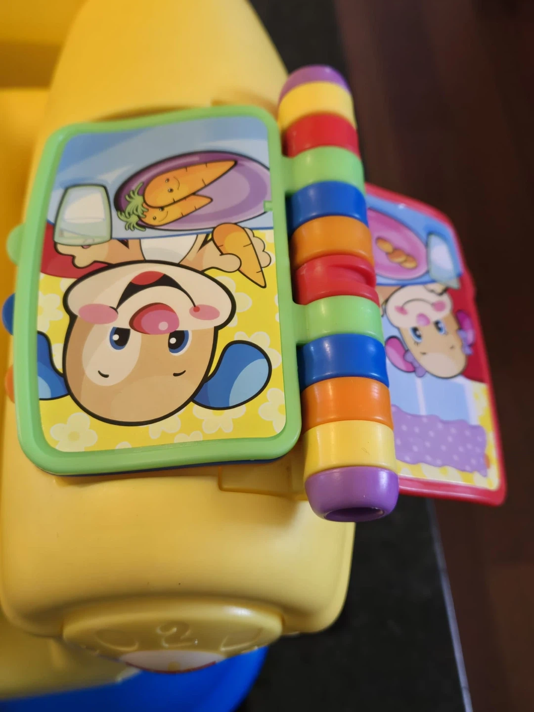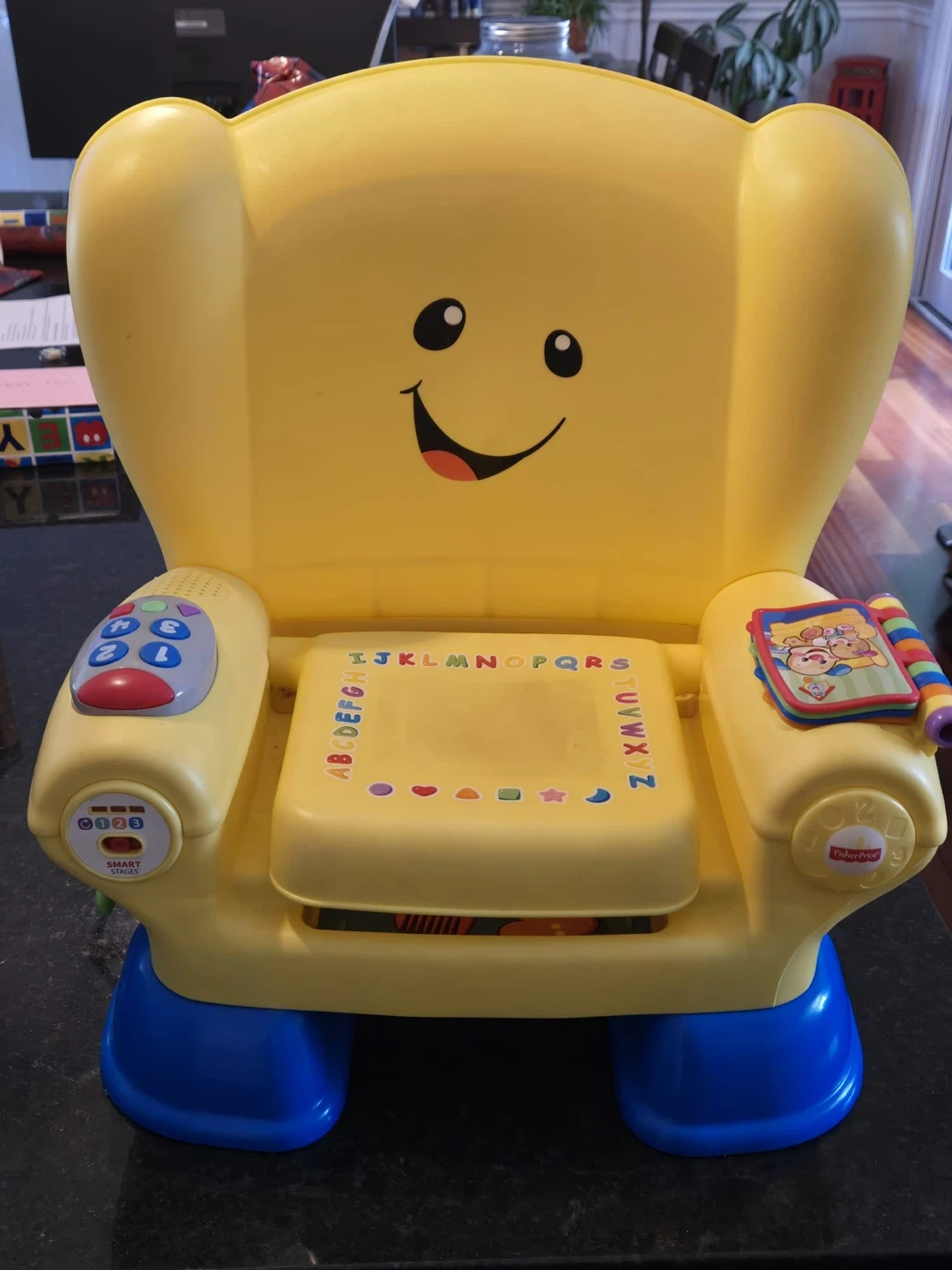 This Fisher-Price Laugh & Learn Smart Stages Chair is perfect for your little one! It's in great condition and ready for a new home. The chair is yellow with blue accents and features interactive buttons and a book to help your child learn and grow. It's designed to grow with your child through different stages of learning, making it a great investment for their development