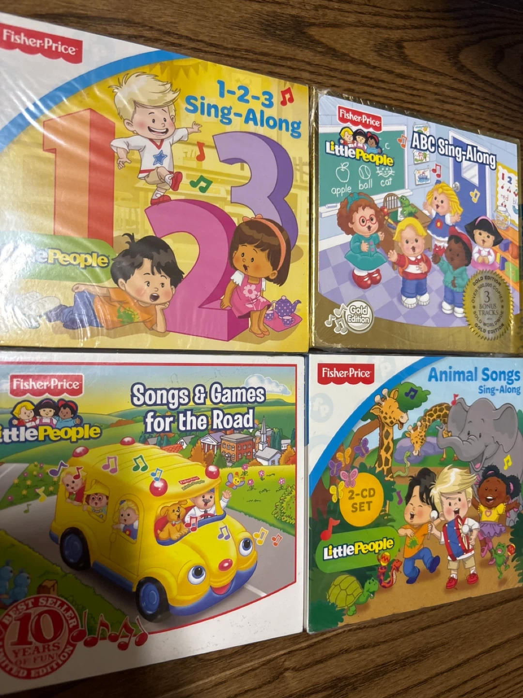 65Selling a set of Fisher-Price Little People sing-along CDs! Includes: - 1-2-3 Sing-Along - ABC Sing-Along (Gold Edition) - Songs & Games for the Road - Animal Songs Sing-Along And bonus! - Let's Get Moving! Fun Action Songs for Kids All still wrapped. Great for the car.