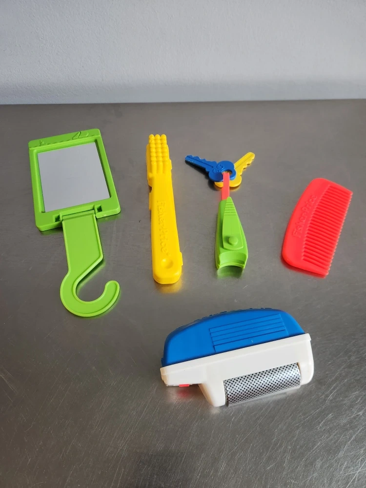 132Selling a Fisher-Price pretend play beauty kit! Includes a red carrying case, comb, mirror, keys, and other accessories for fun pretend play
