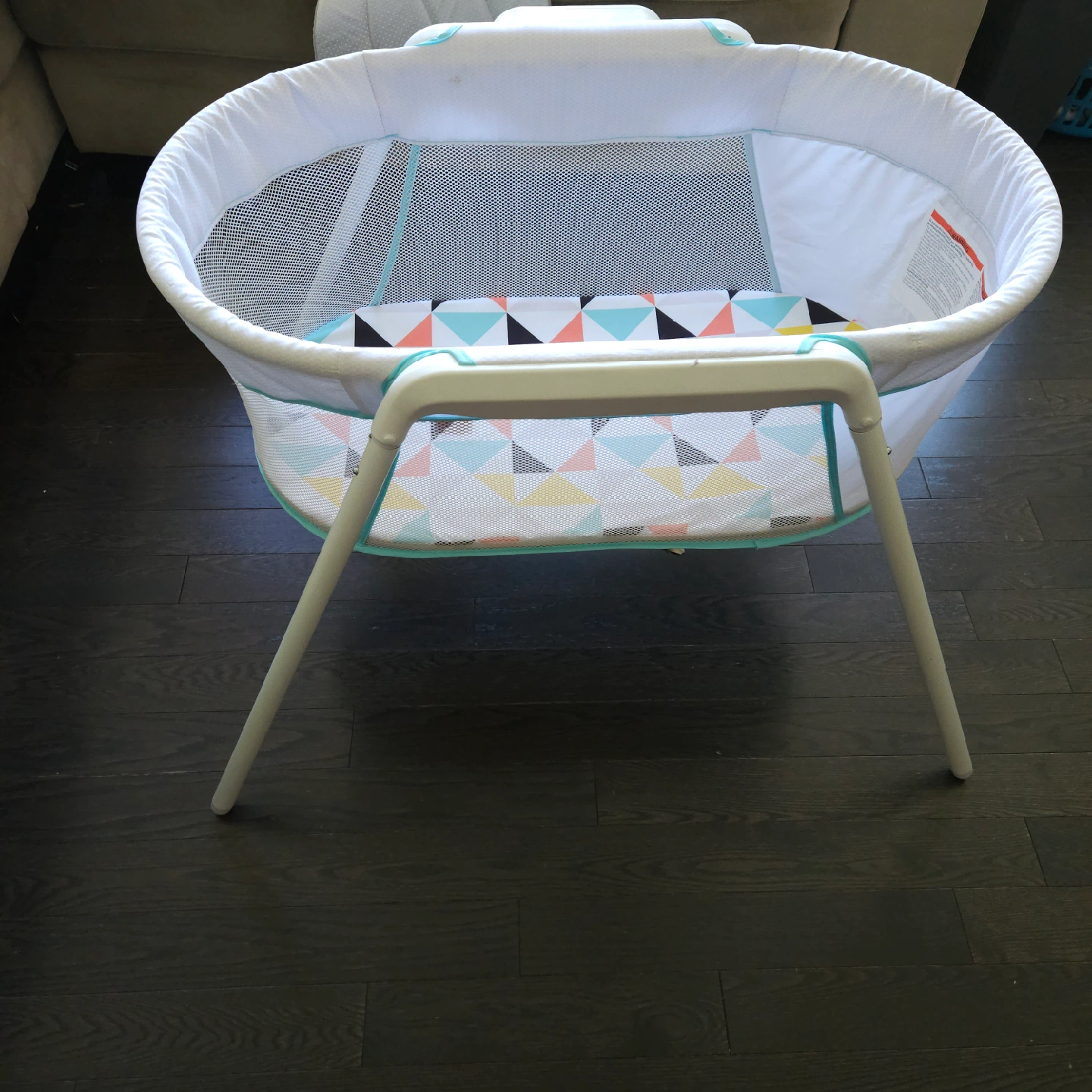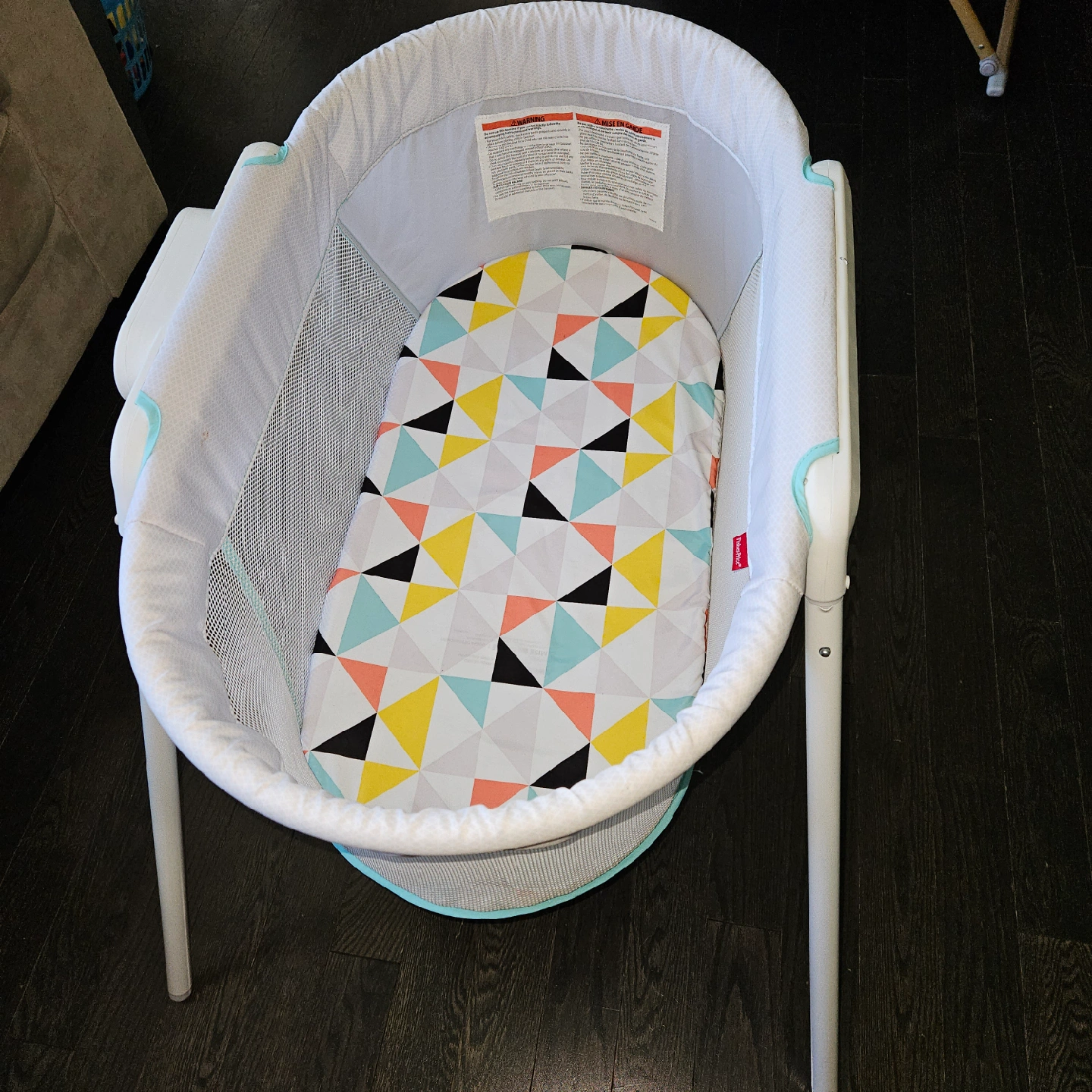60Selling a Fisher-Price Soothing Motions Bassinet! It's in great condition and ready for a new little one. The bassinet features a calming motion to help your baby drift off to sleep, and the mesh sides provide good airflow. The colourful geometric pattern is super cute too! Comes with a carrying case.
