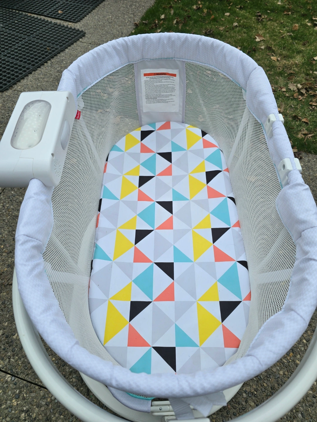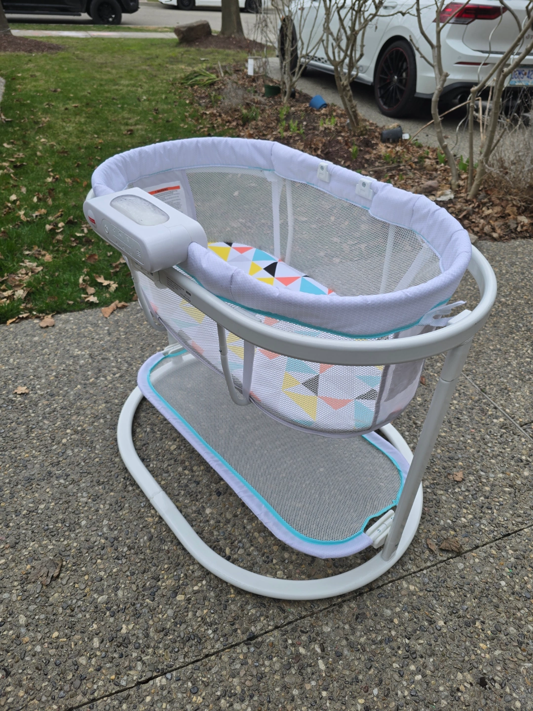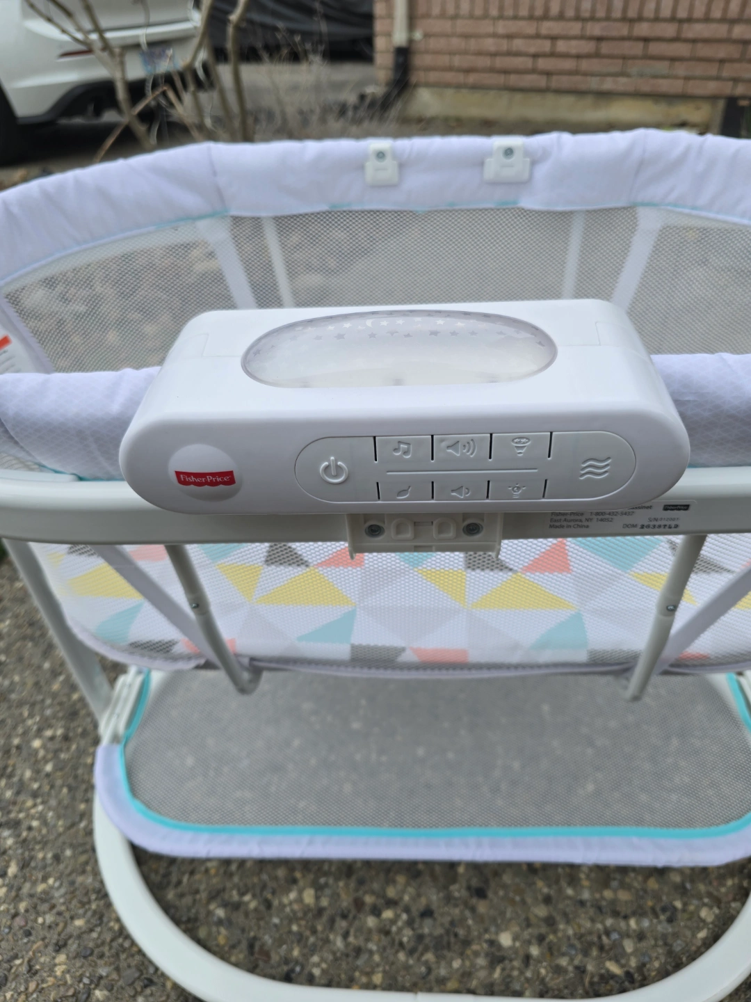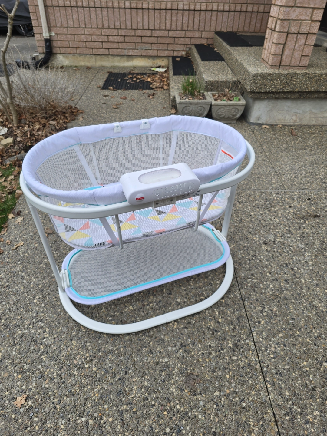 10Baby bassinet with soothing vibrations. Features include light and sounds. Portable and lightweight design. Geometric patterned mattress included.