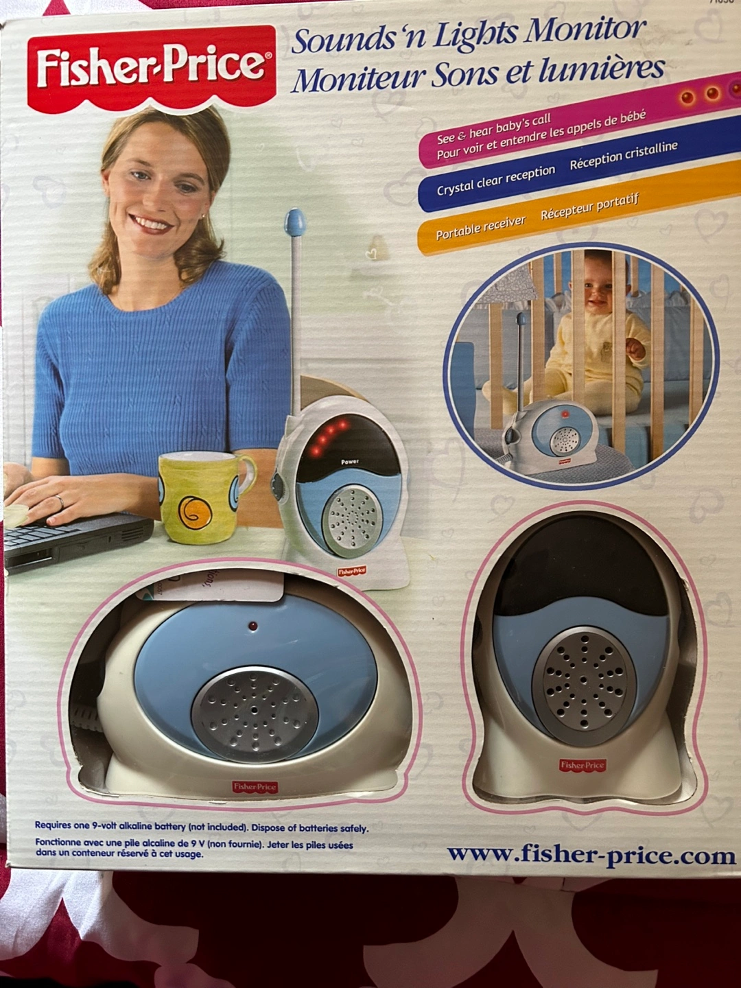 87Selling a Fisher-Price Sounds 'n Lights Monitor. This monitor has two channels to minimize interference and a power indicator light. The receiver is powered by AC or battery. It also has a variable light display that lets you "see" the sounds baby makes