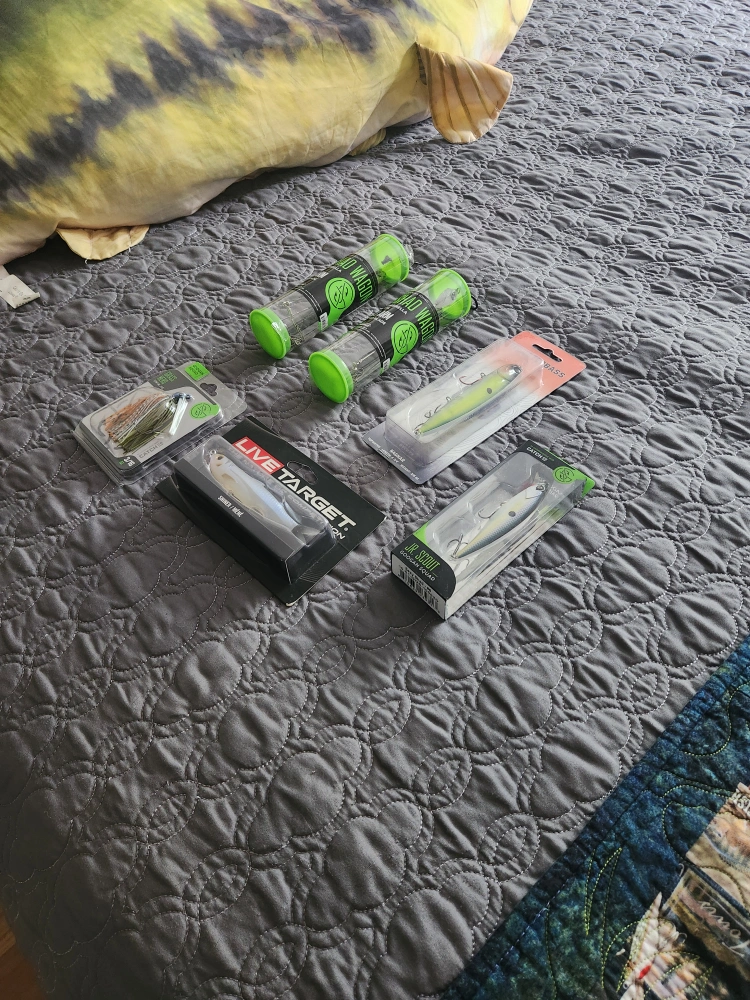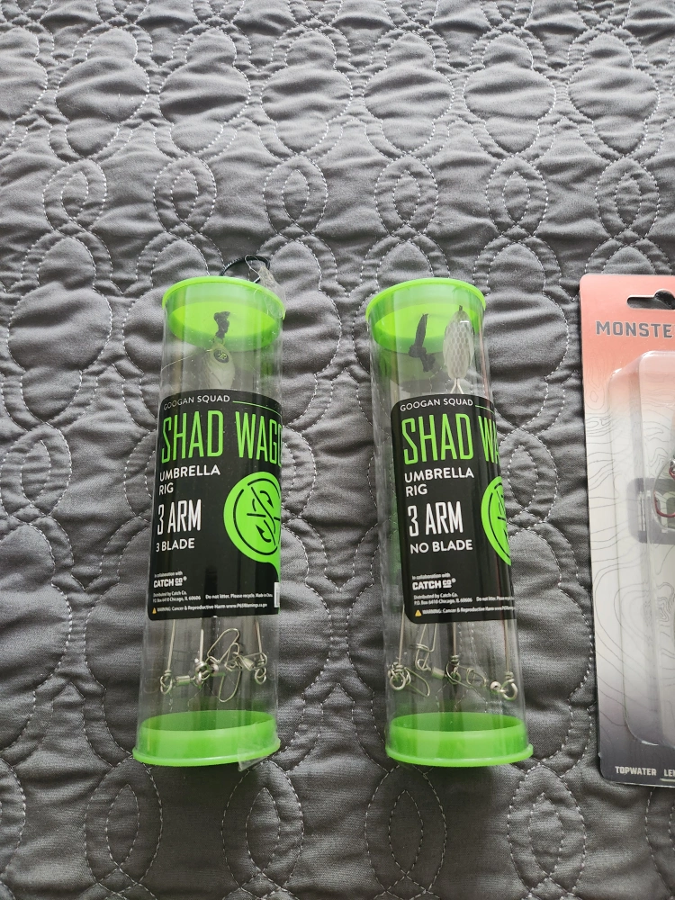 Selling a variety of fishing lures, including: - Googan Squad Jr. Scout - Googan Squad Shad Wagon 3 Arm Umbrella Rig - Monsterbass Ragnar Topwater - Googan Squad Grass Hero Swim Jig - LiveTarget