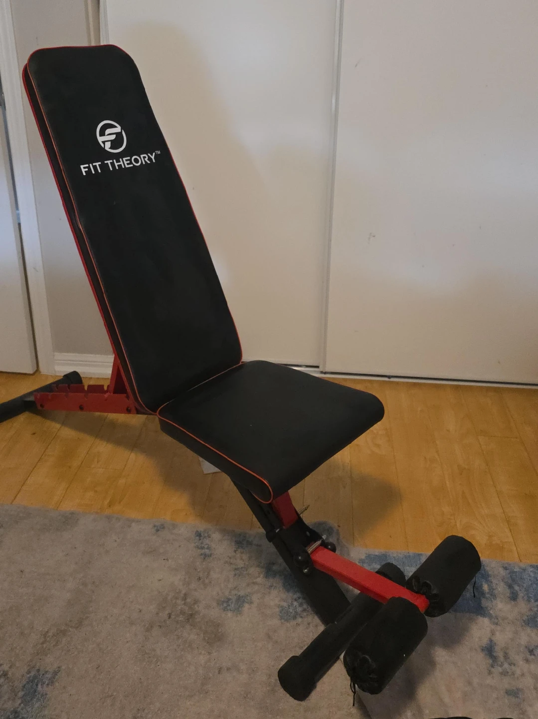 10Selling a Fit Theory adjustable weight bench! It's in great shape and ready for your home gym setup. The bench is black with red accents.