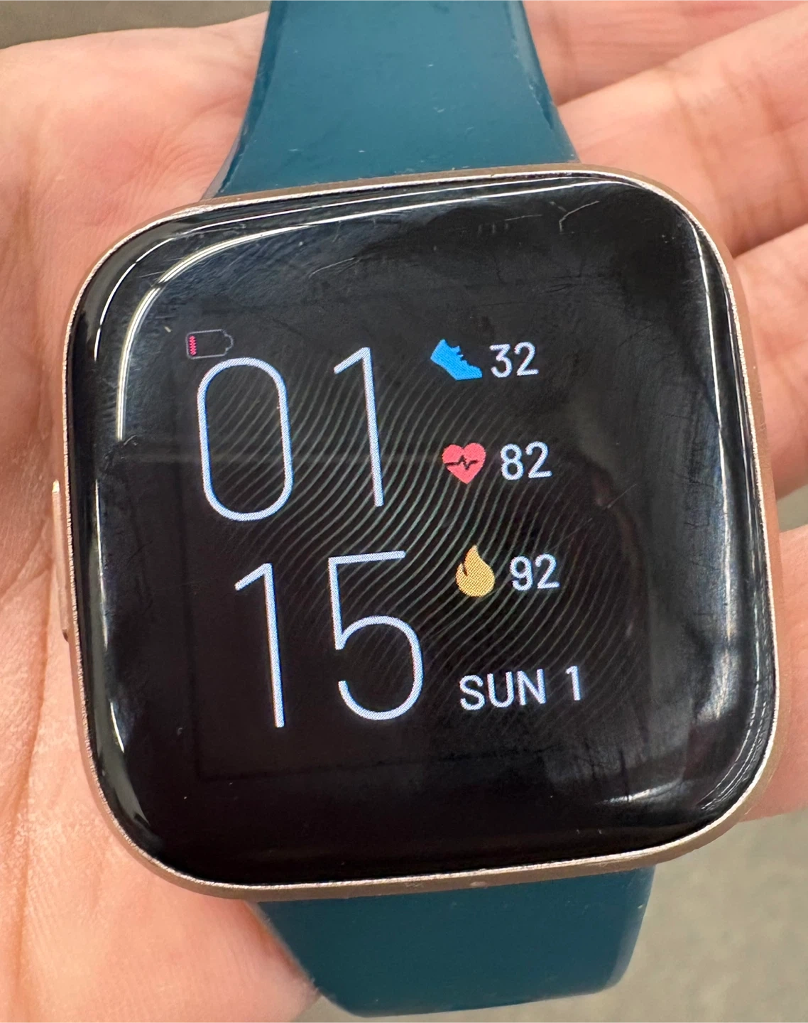 10Selling a Fitbit Versa smartwatch! It tracks steps, heart rate, and more. The screen has some scratches, as shown in the photos, but it functions perfectly. The band is a teal colour.