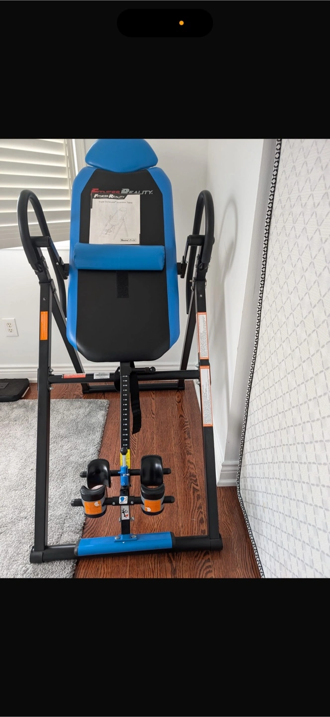 Inversion table, blue and black. Adjustable height. Footrests included. Good for back pain relief.