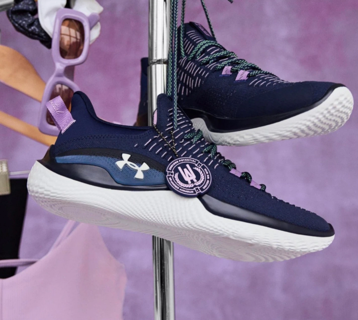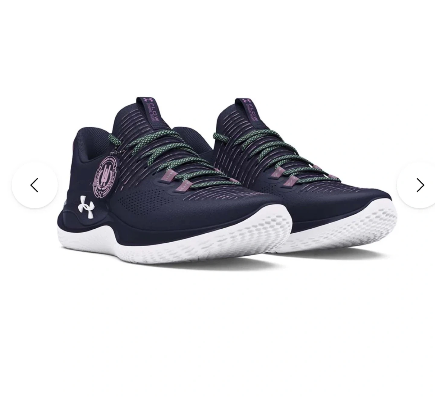 Check out these Under Armour Flow Go running shoes! They're a new and stylish navy and purple colour, perfect for adding a pop to your workout gear. These shoes are designed for comfort and performance, so you can go the distance. They feature the Under Armour logo and a unique design with green laces.