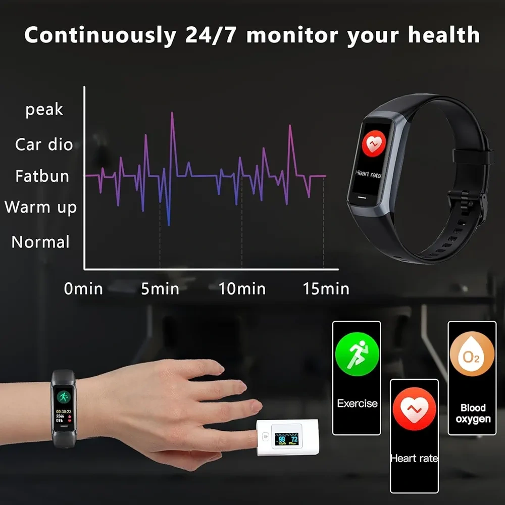This fitness tracker has a full touch screen and is IP68 waterproof, so you can even use it while swimming! It tracks your heart rate, blood oxygen, sleep, steps, distance, and calories burned. It also has smart notifications and an alarm clock function