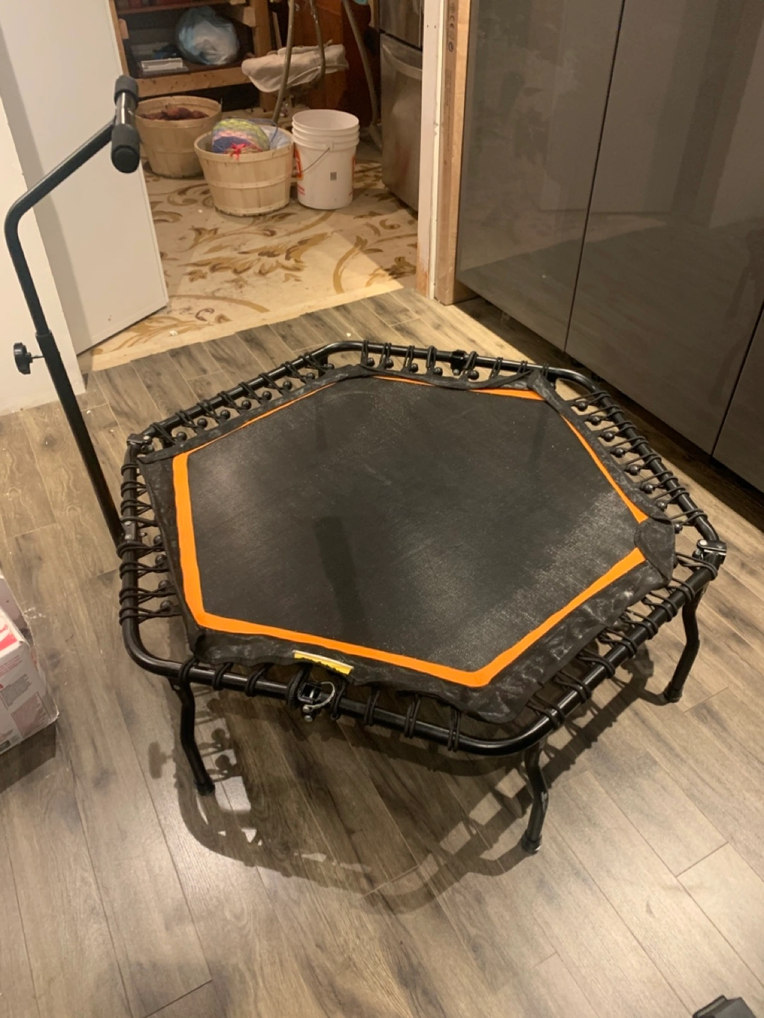 Selling a fitness trampoline in good condition! It features a handle bar for added stability during workouts. Perfect for low-impact cardio and exercise at home.