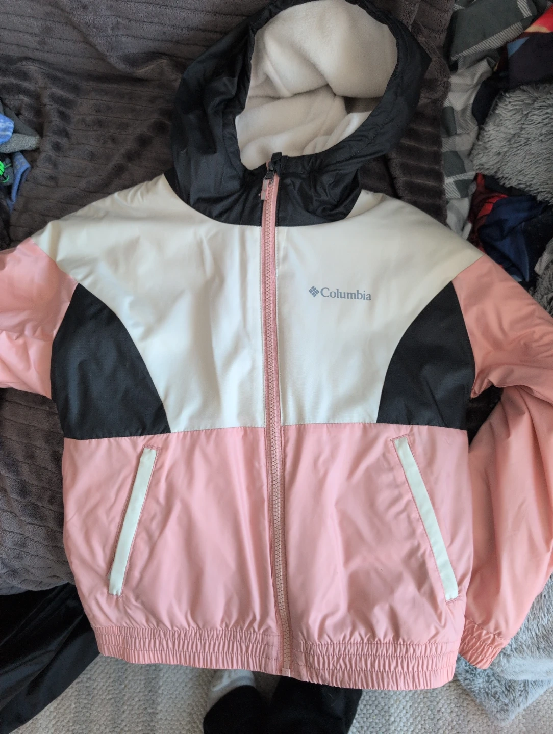 Columbia jacket with a colour-blocked design featuring pink, white, and black panels. It's lined with a soft, fuzzy material and has a full zipper closure. This windbreaker-style jacket is suitable for cool weather.