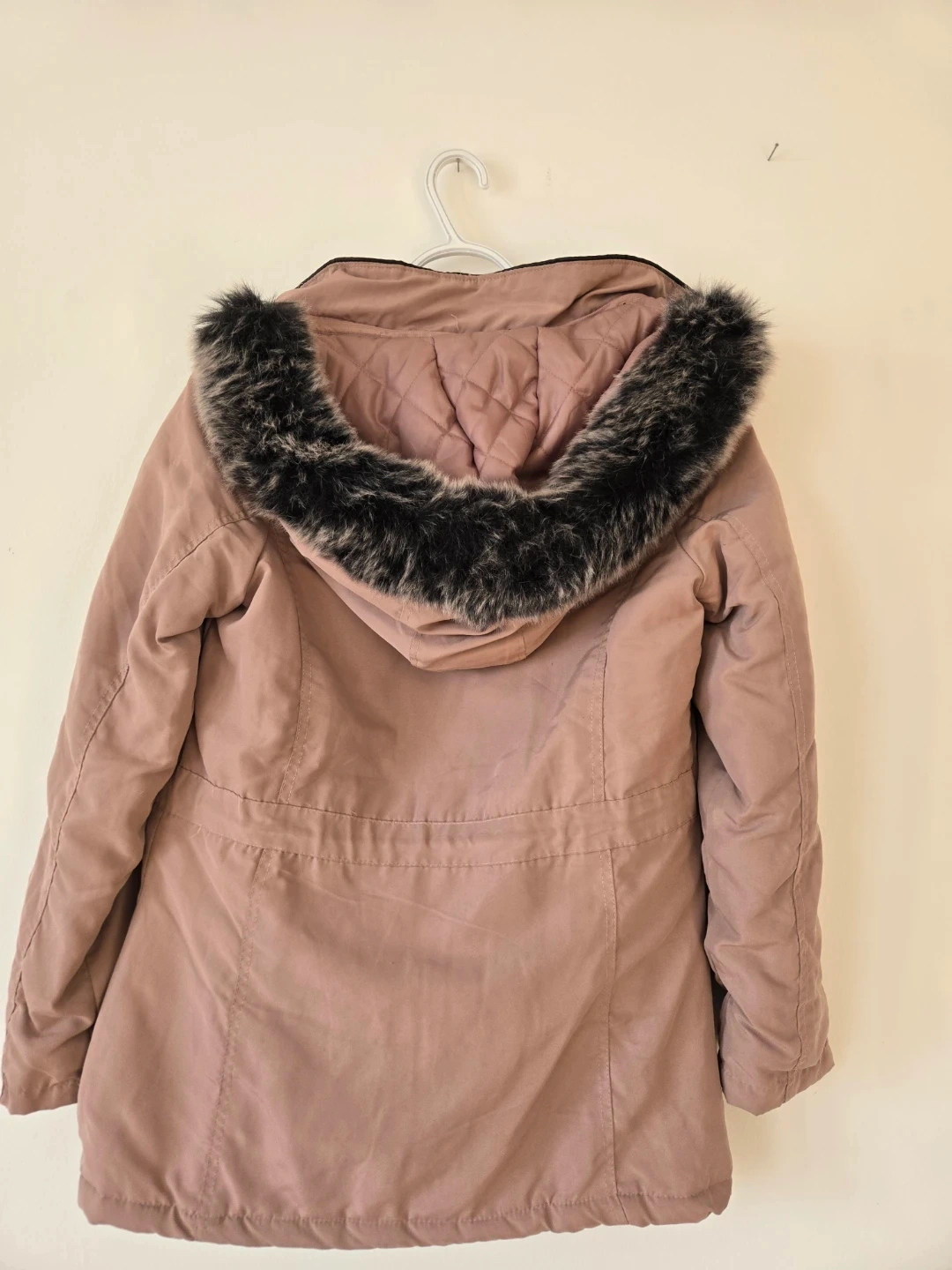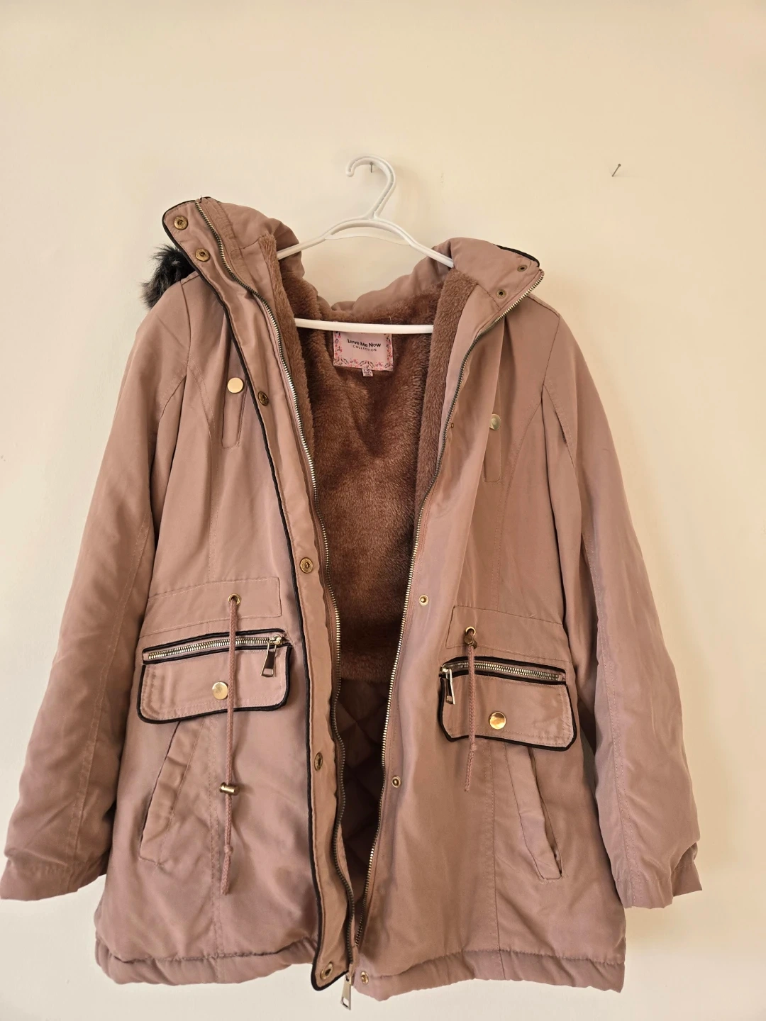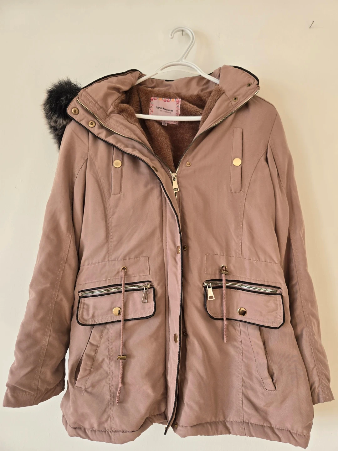This warm parka jacket is from Love Me More. It features a cozy faux fur-lined hood (detachable) and multiple zippered pockets. The shell is a taupe-coloured polyester blend. It has some minor wear/manufacturing defect, including a small tear near the pocket on the left side. Pickup only. No refund
