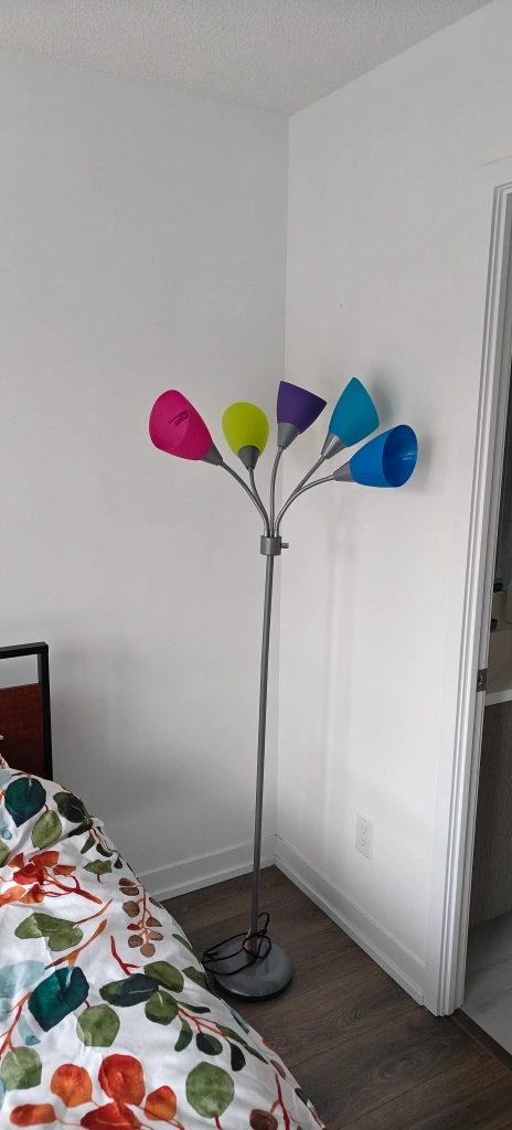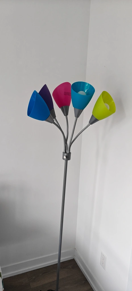 Five-light floor lamp. Adjustable gooseneck arms. Multicoloured shades: pink, purple, blue, light green, and yellow. Silver-toned metal base and arms. Great for a child's room or playful decor. Retail price is 90 plus tax.