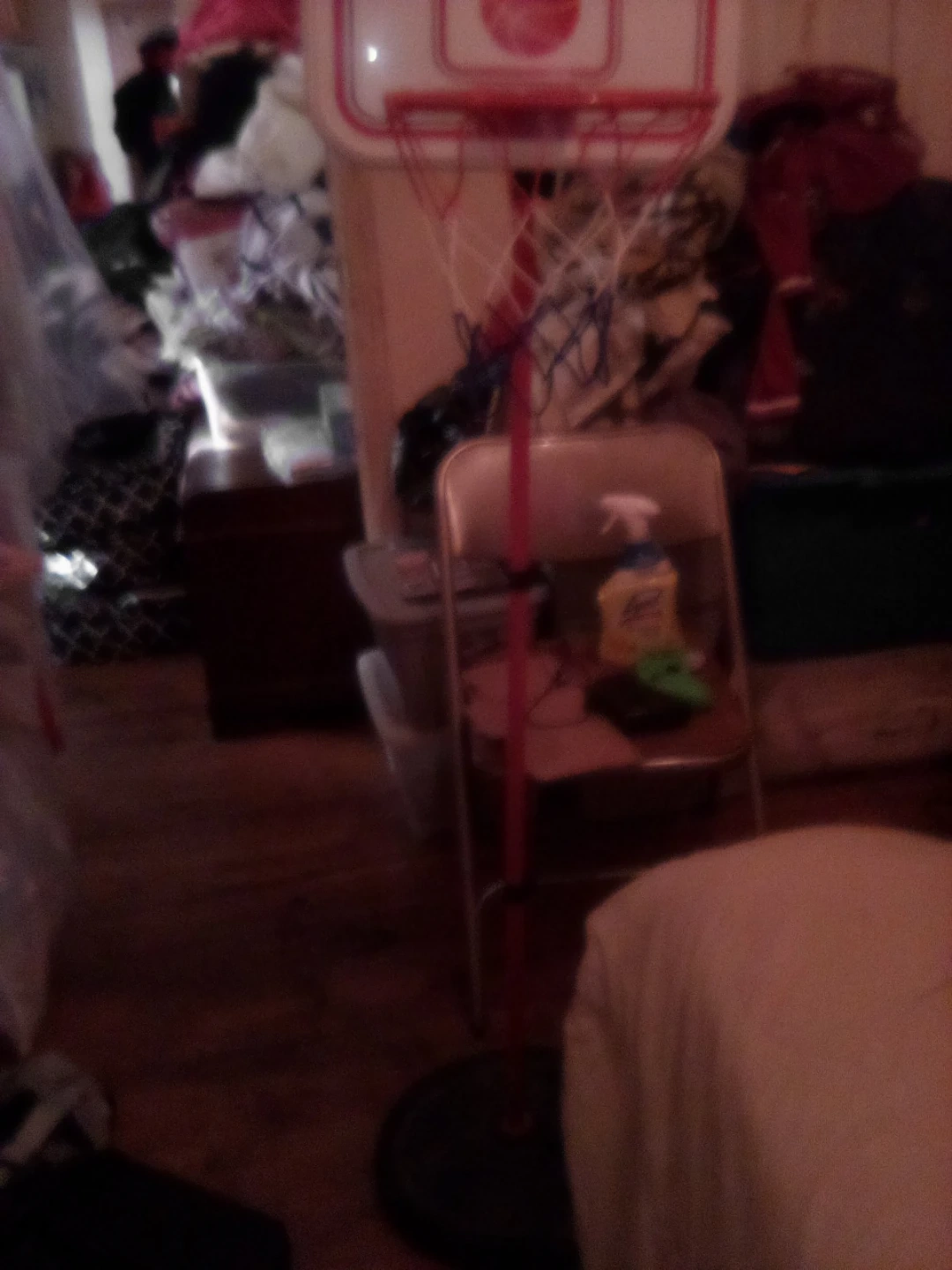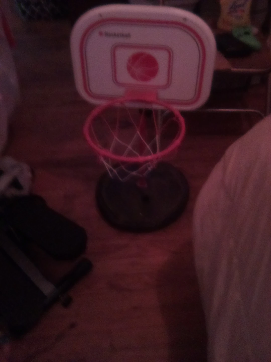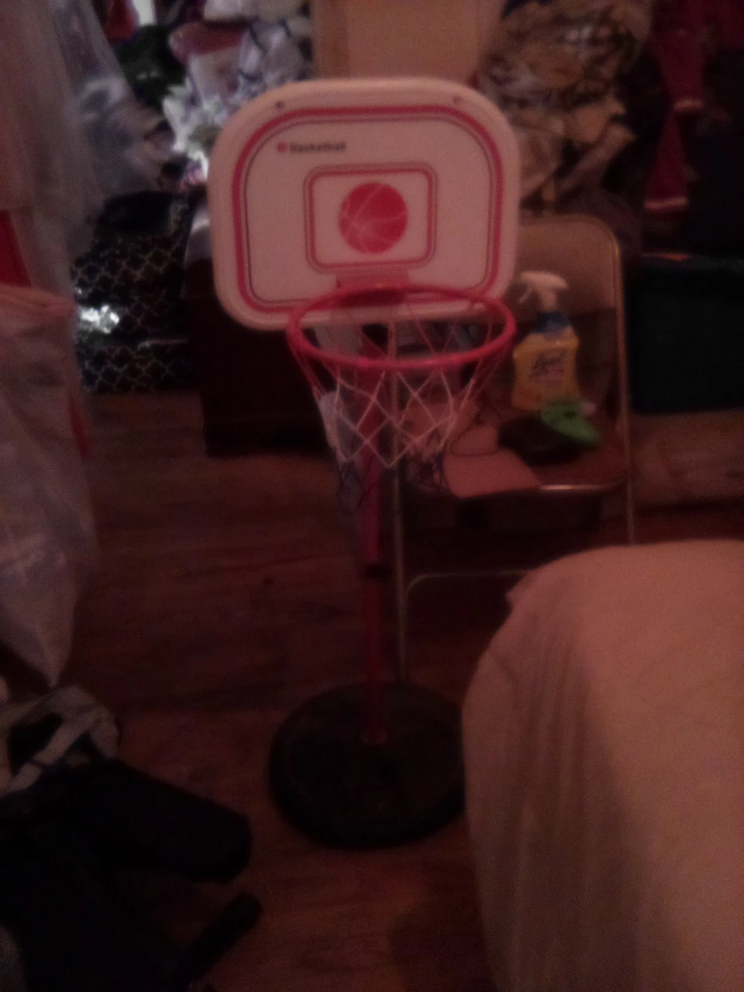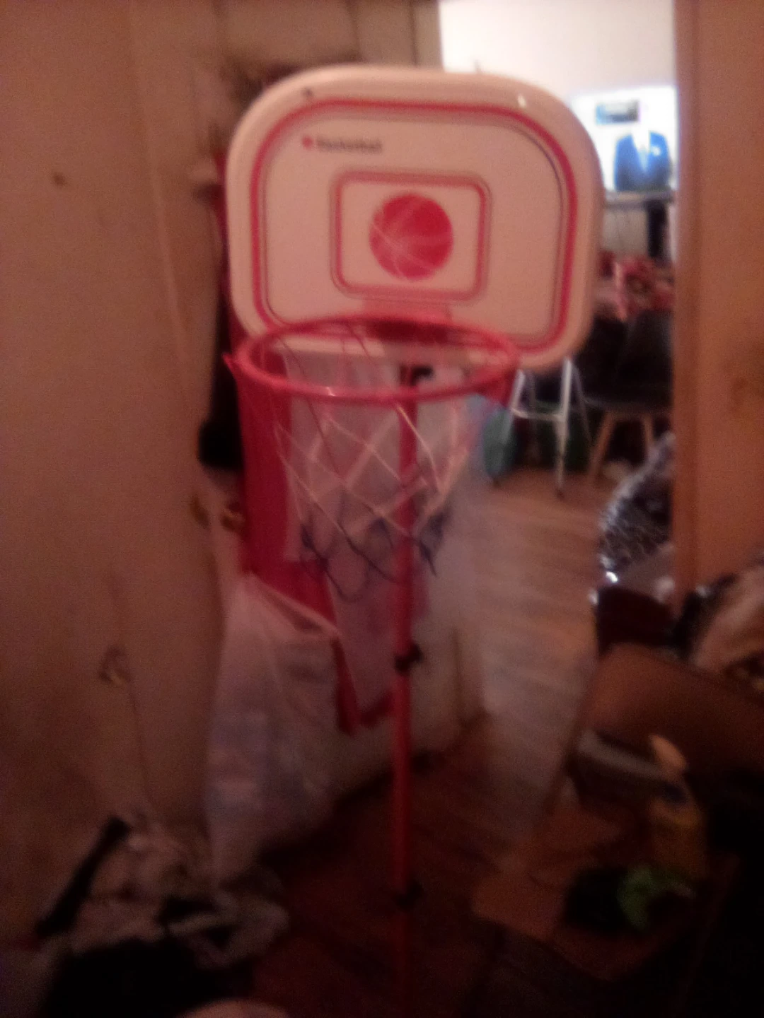 This portable basketball hoop stand is perfect for indoor or outdoor play. It's adjustable for different heights. Includes backboard, hoop, and net. Great for developing coordination!
