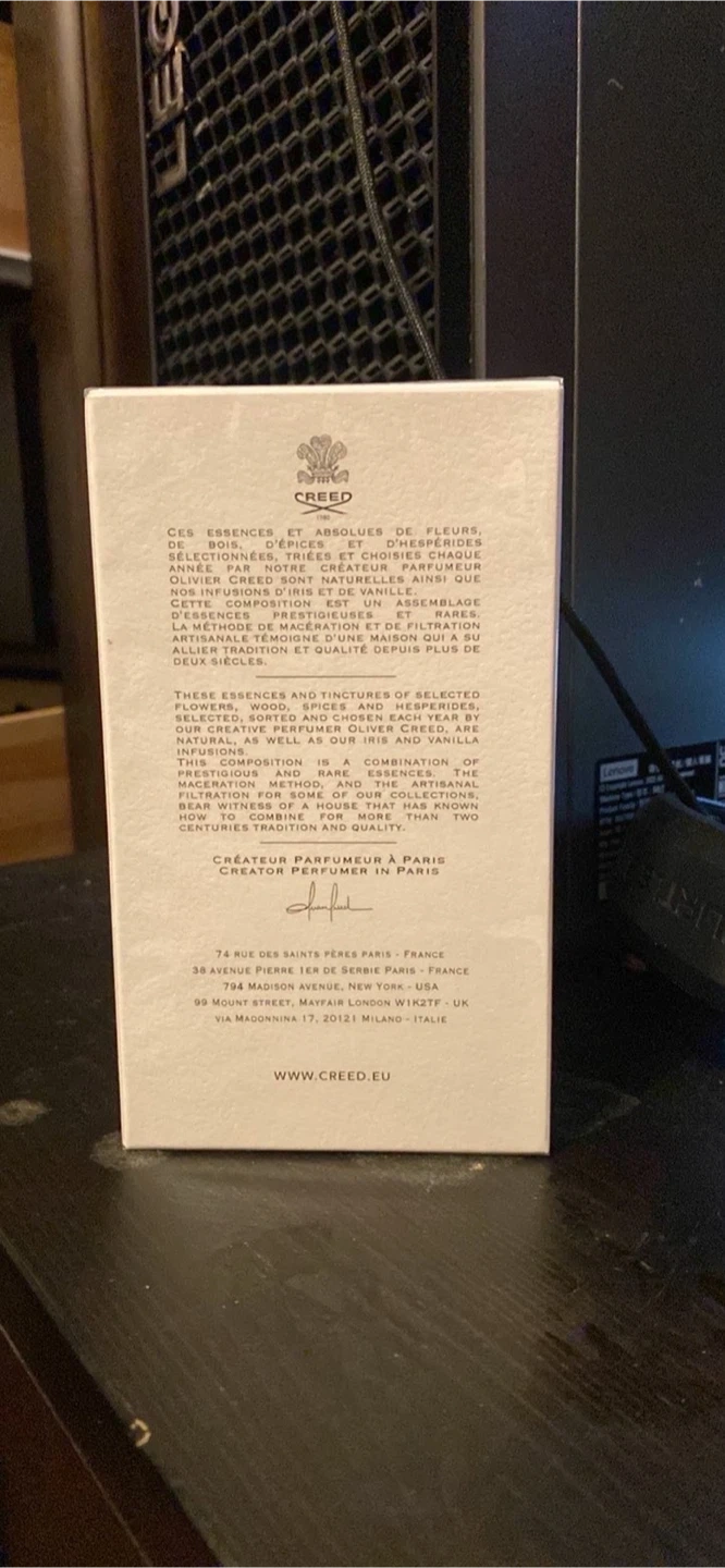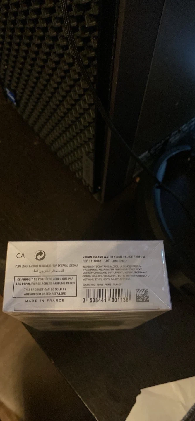 CREED Virgin Island Water Eau de Parfum for external use only. It's a 100ml bottle made in France. This fragrance is a combination of select essences and tinctures of flowers, citrus, and marine notes. It's crafted using traditional methods with a two-centuries-old recipe.