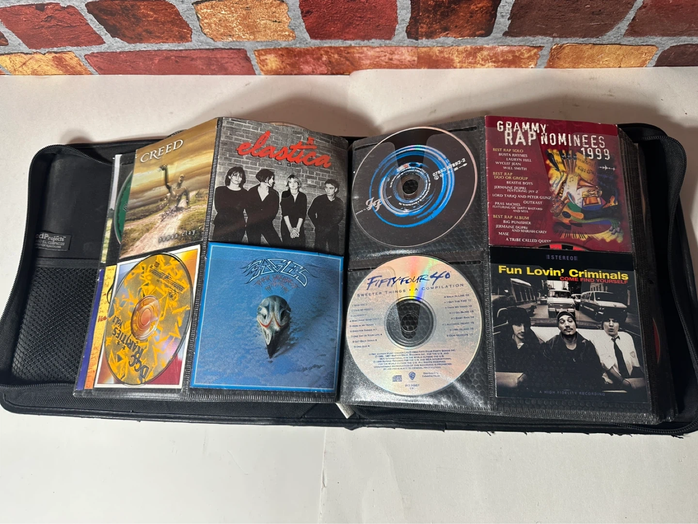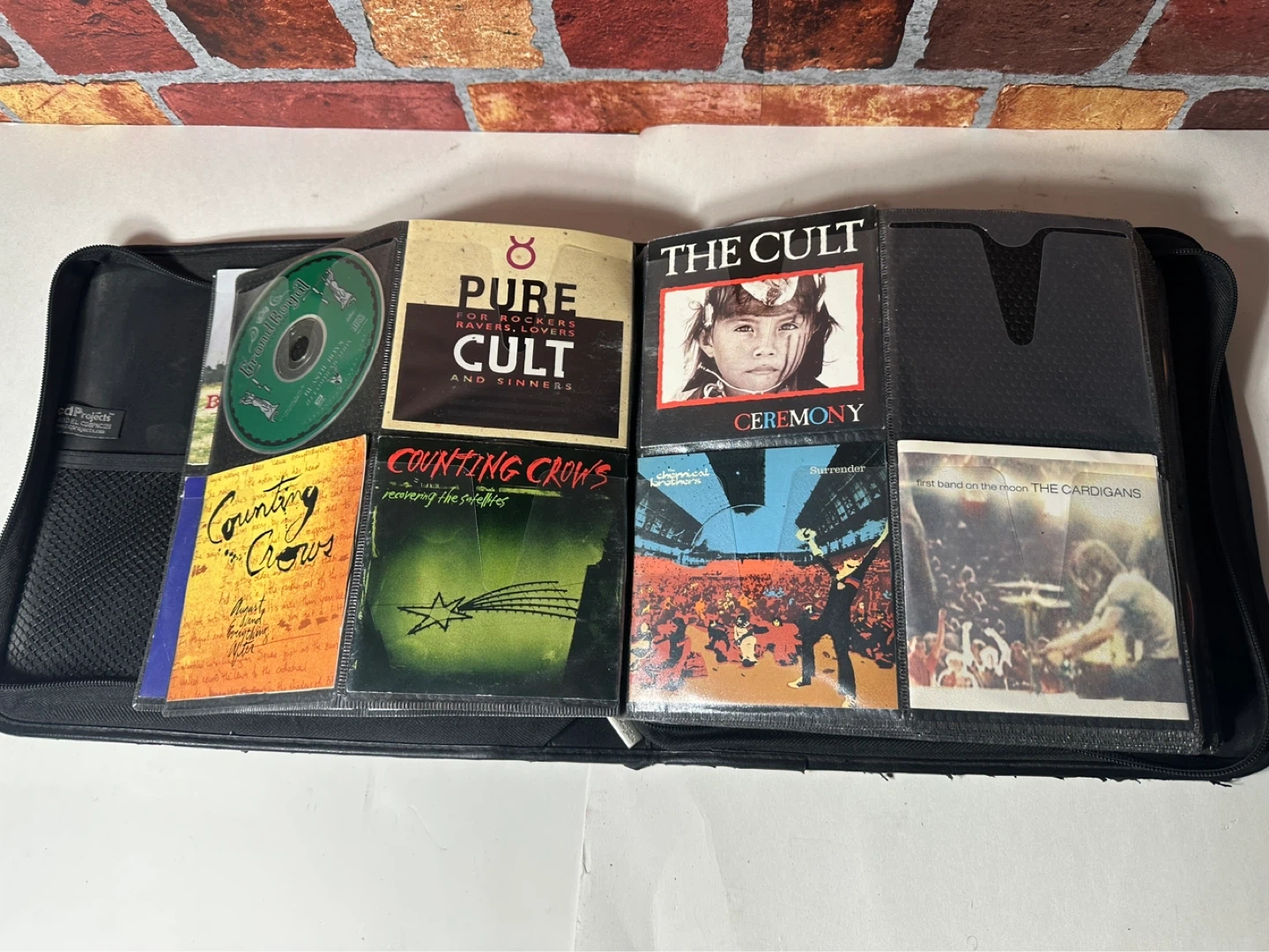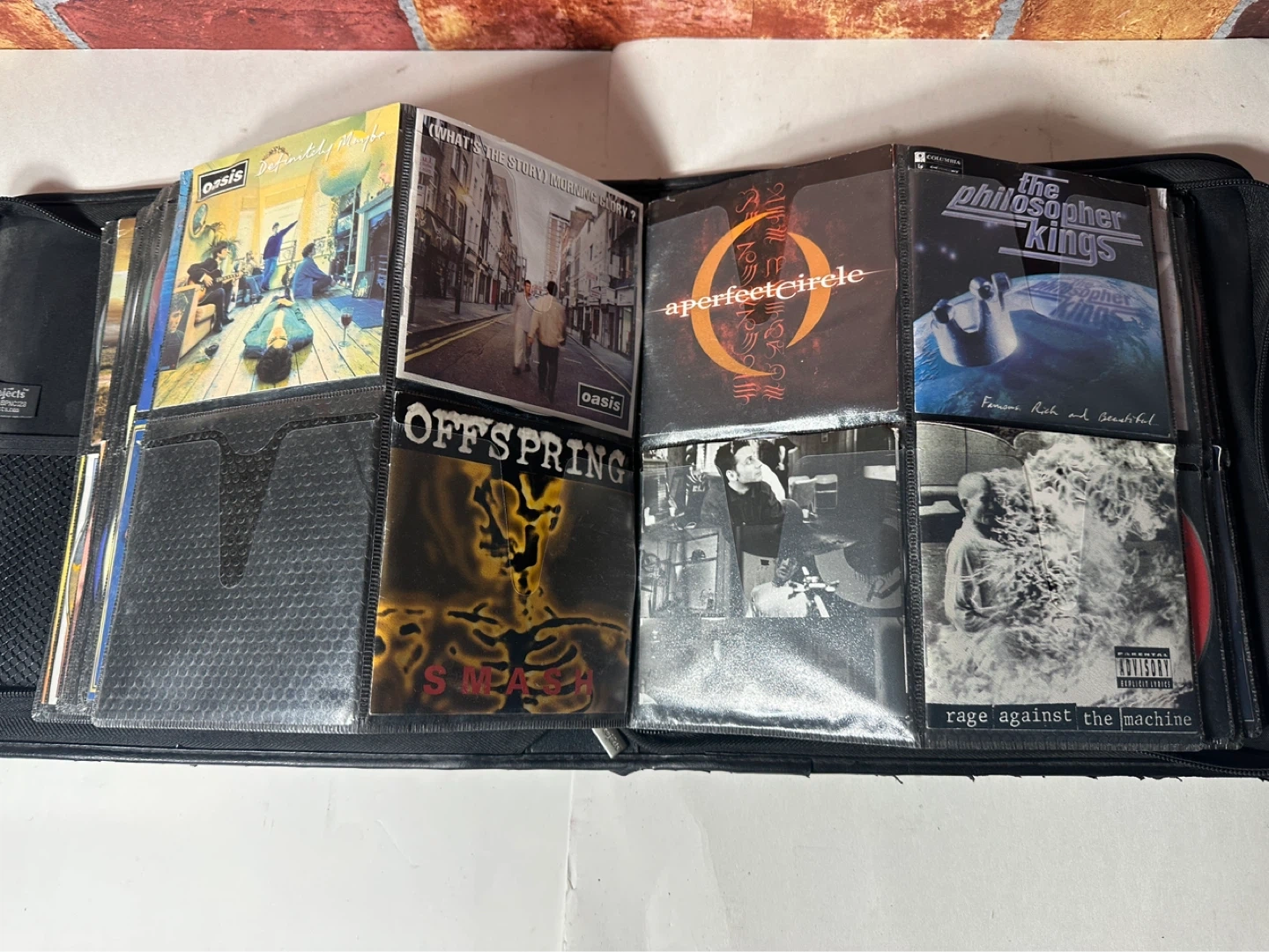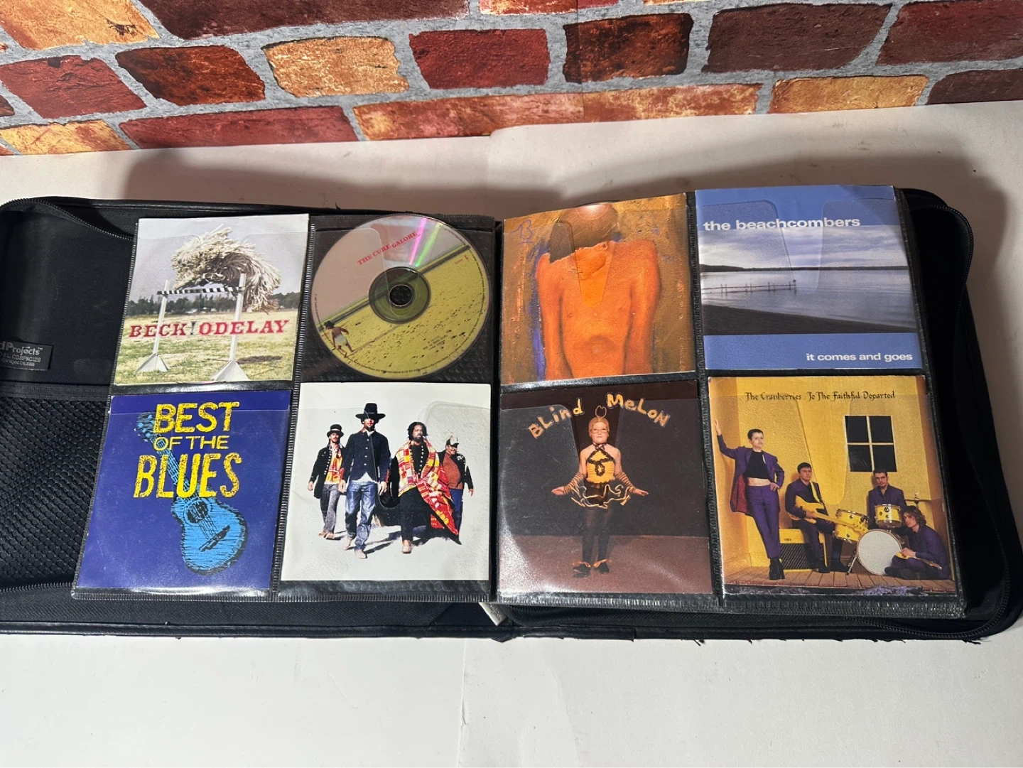A collection of various CDs including artists like Beck, The Cranberries, Blind Melon, and more. This set comes in a black carrying case with multiple sleeves for organization.