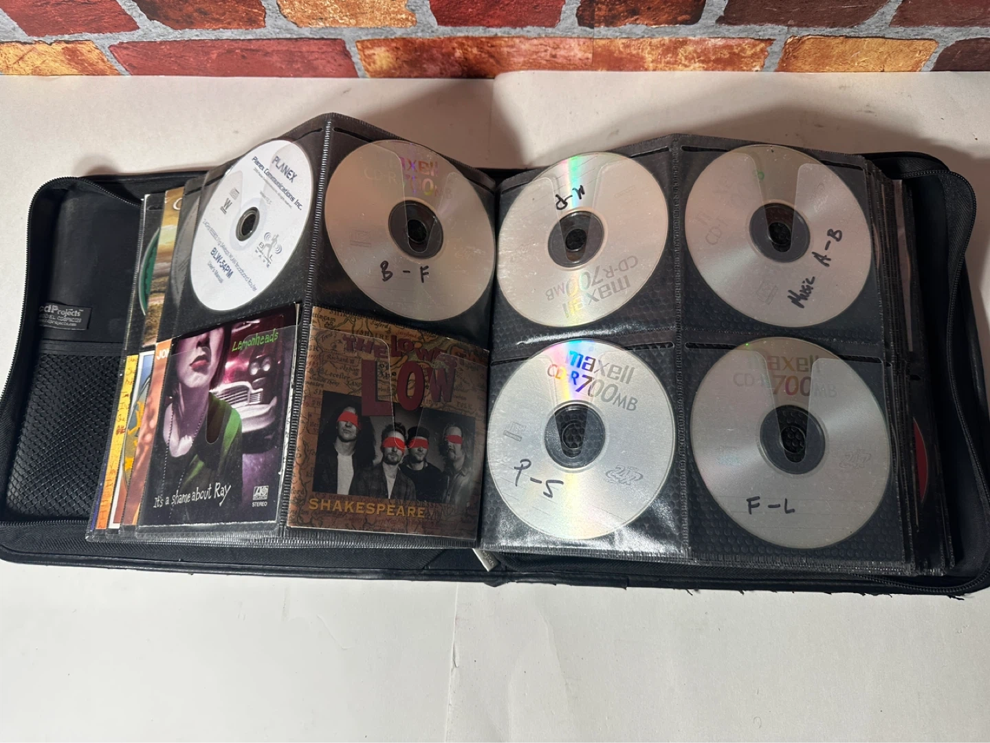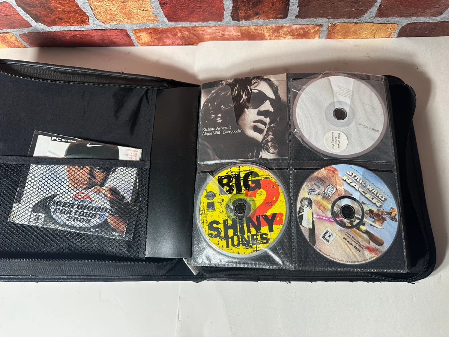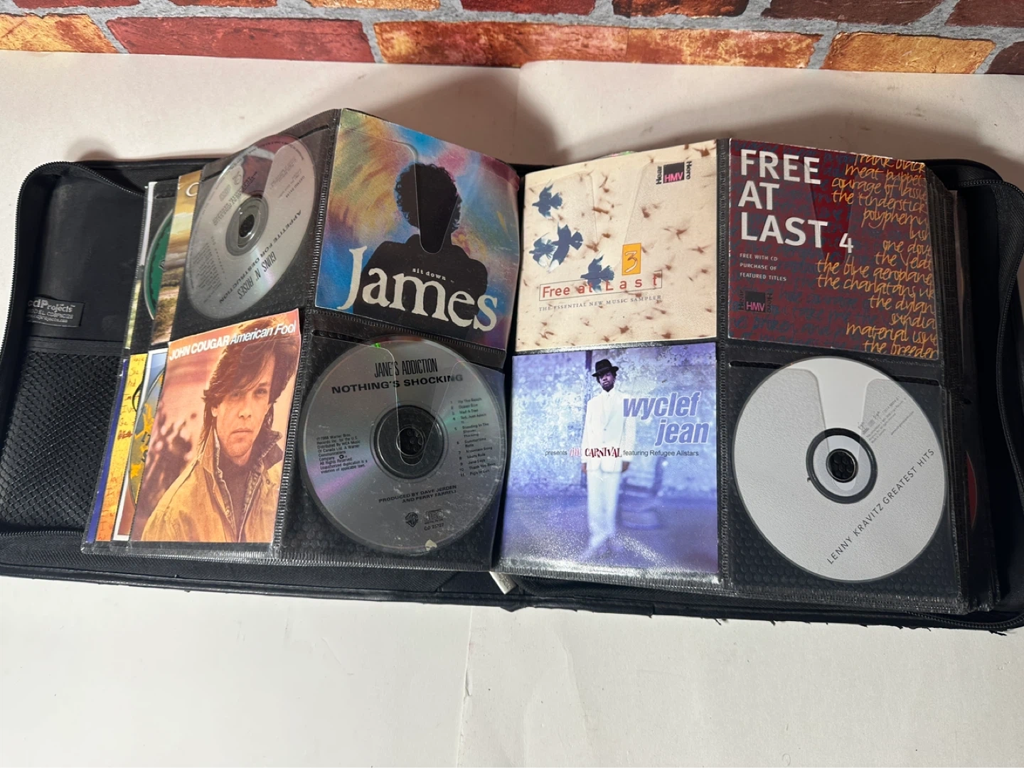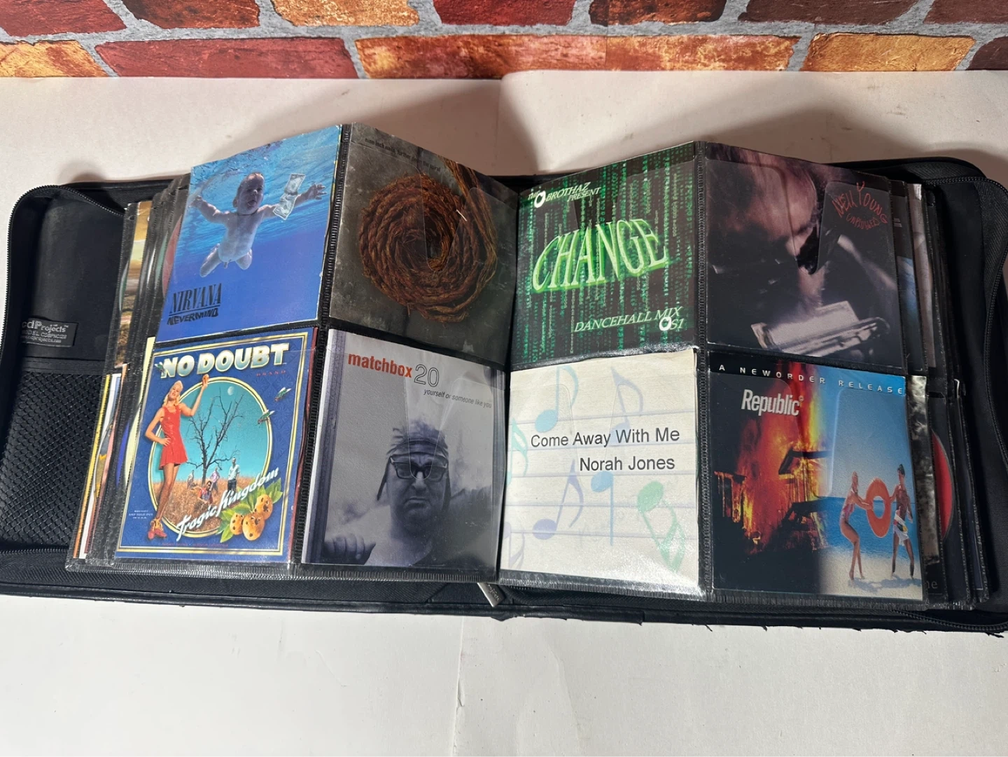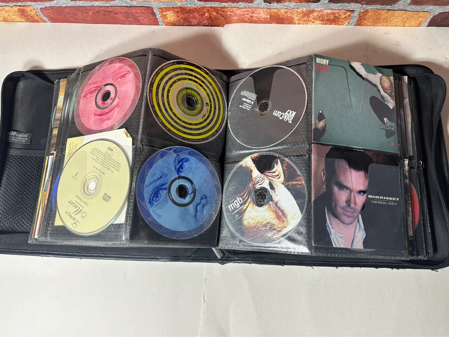 A collection of various CDs including artists like Beck, The Cranberries, Blind Melon, and more. This set comes in a black carrying case with multiple sleeves for organization.