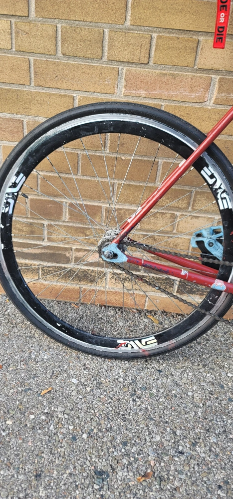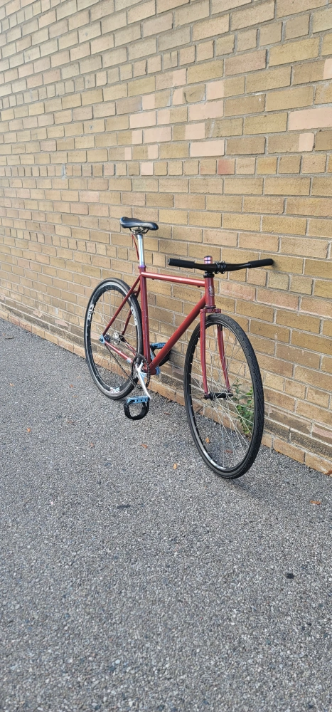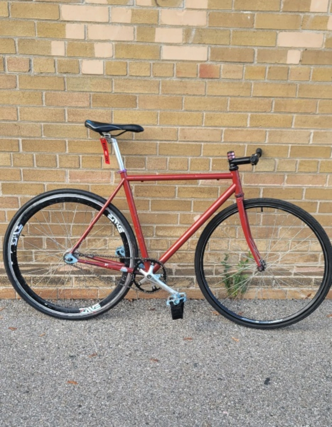 Selling a fixed gear bike with a cool red frame. Custom built comes with expensive components such as Sugino Crankset and an ENVE rear wheel. Set price is 185$. Still rides like new and is ready for a new home. Size small 44/15 Ratio