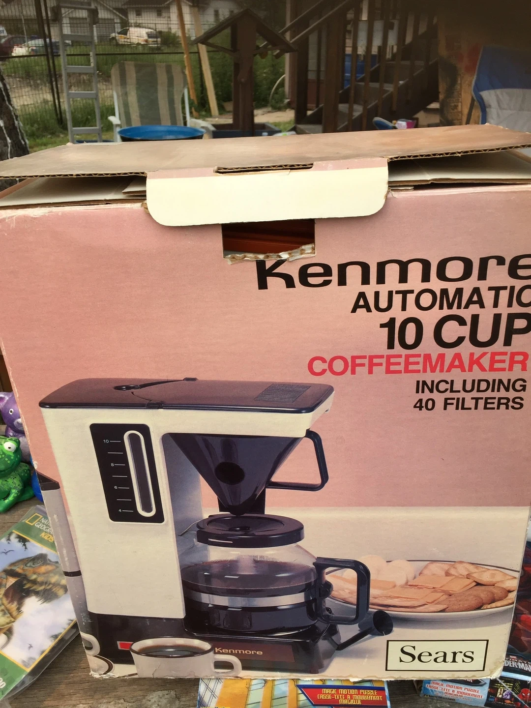 This Kenmore automatic coffee maker brews up to 10 cups. It includes 40 filters. Glass carafe included.