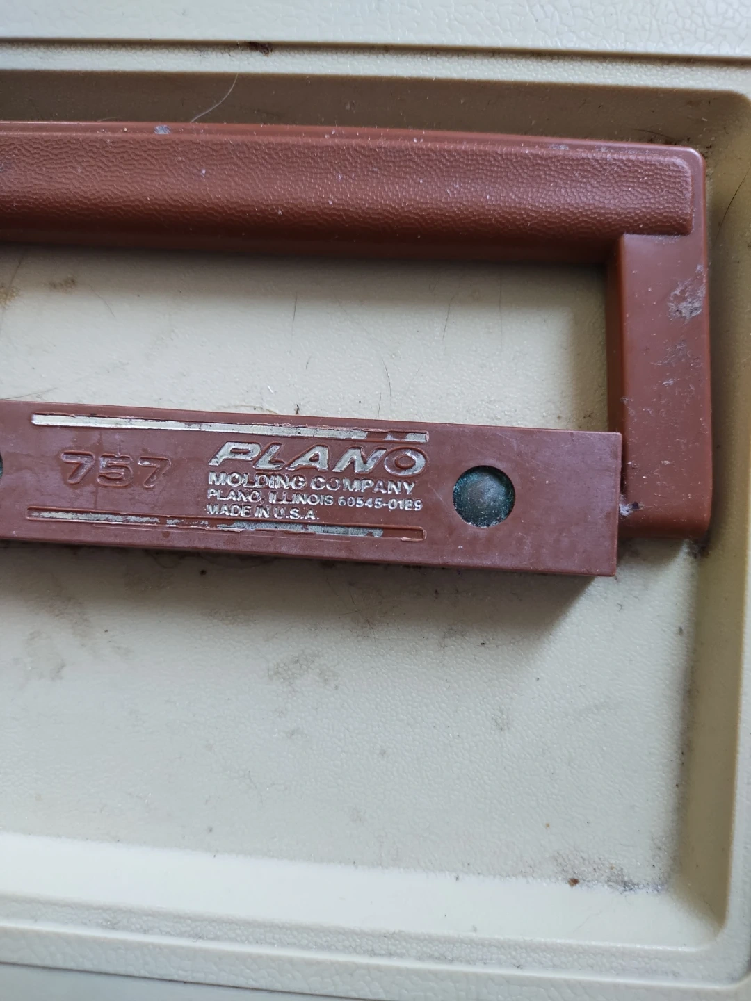 Vintage Plano 757 tackle box with multiple compartments. It's filled with various beads, chains, clasps, and jewelry-making tools like pliers. Great for organizing crafts or small items! Includes everything inside. Without contents, box is 25$.