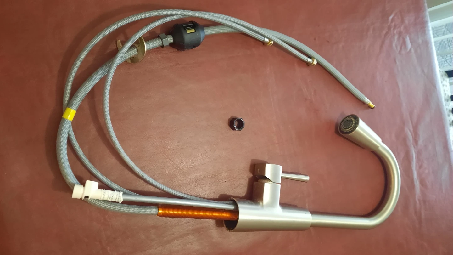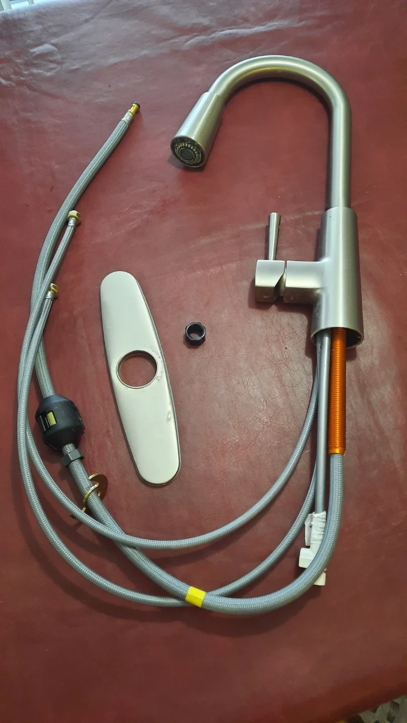 A brushed nickel kitchen faucet with a pull-down sprayer is included. It comes with water supply lines and a deck plate for installation. This faucet is made of stainless steel. Bought for $199.00. Less than 2 years old. Removed for a renovation. Works perfectly.