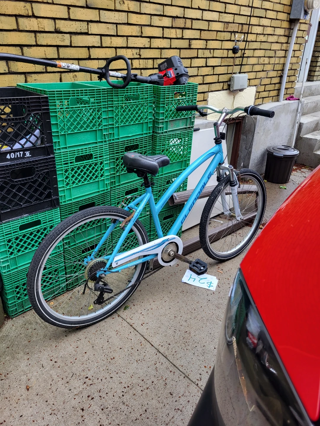 This blue hybrid bicycle features a comfortable upright riding position. It has 27-inch wheels and a sturdy frame. Perfect for leisurely rides around town!