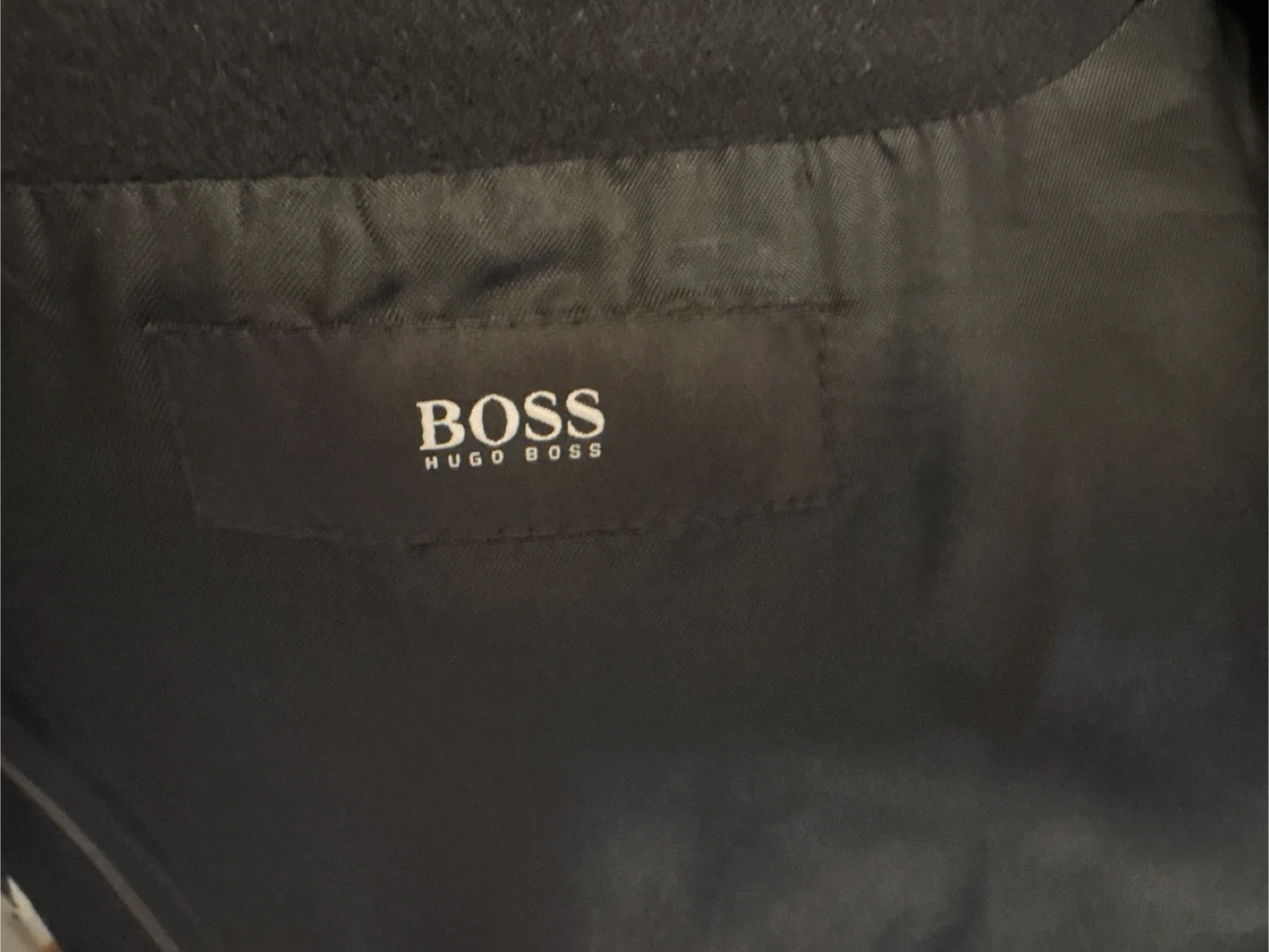 This is a black wool and cashmere blend coat from BOSS Hugo Boss. It's made in Italy and features a mandarin collar with a button closure. The coat is a size 46R. It's a great piece for cooler weather! Lining needs replacement. Some fraying on pockets.