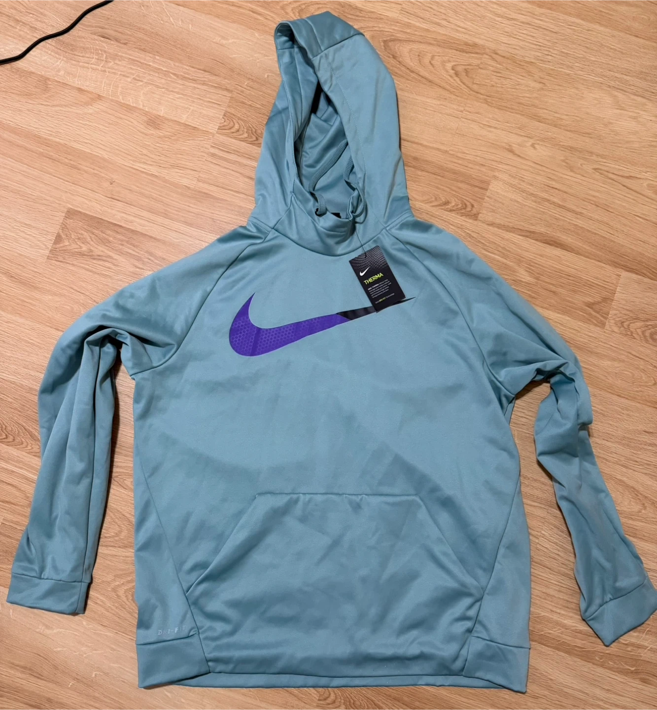 Light blue Nike Dri-FIT Therma hoodie with a large purple swoosh logo. It's made with Therma fabric to help keep you warm. Size XL.