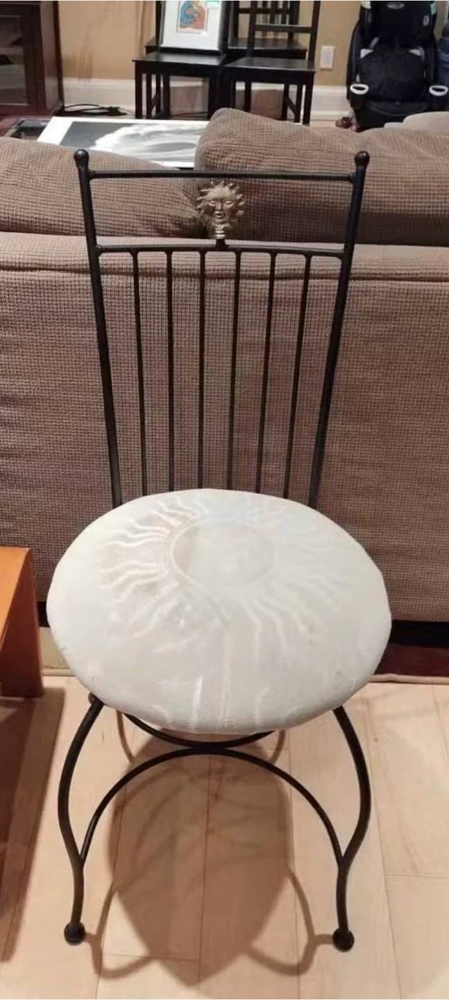 This metal dining chair features a decorative sun motif on the backrest and a cushioned seat. Its dark metal frame provides a sturdy base. It's a charming accent piece for a kitchen or dining area.