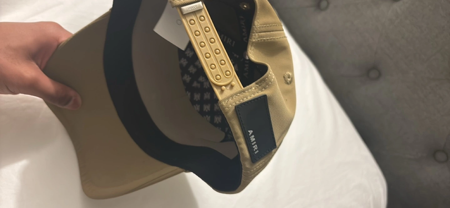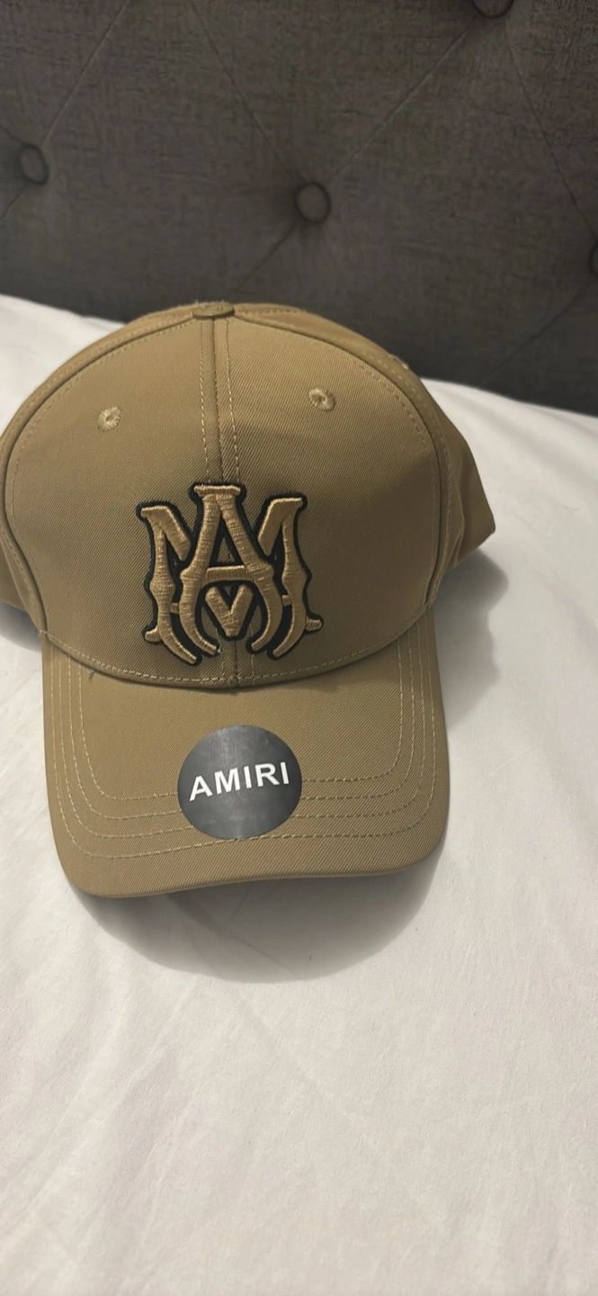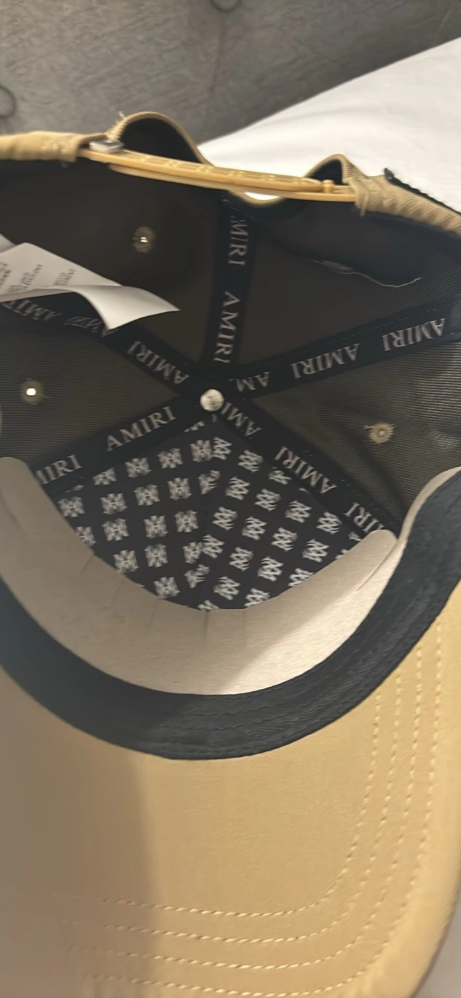 Men's AMIRI beige baseball cap. Features a monogram logo on the front and repeating logo on the inner band. Adjustable strap. Excellent condition.