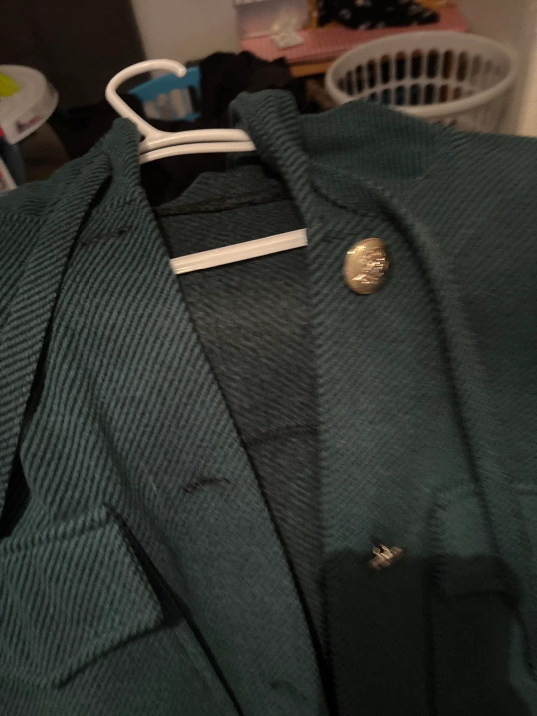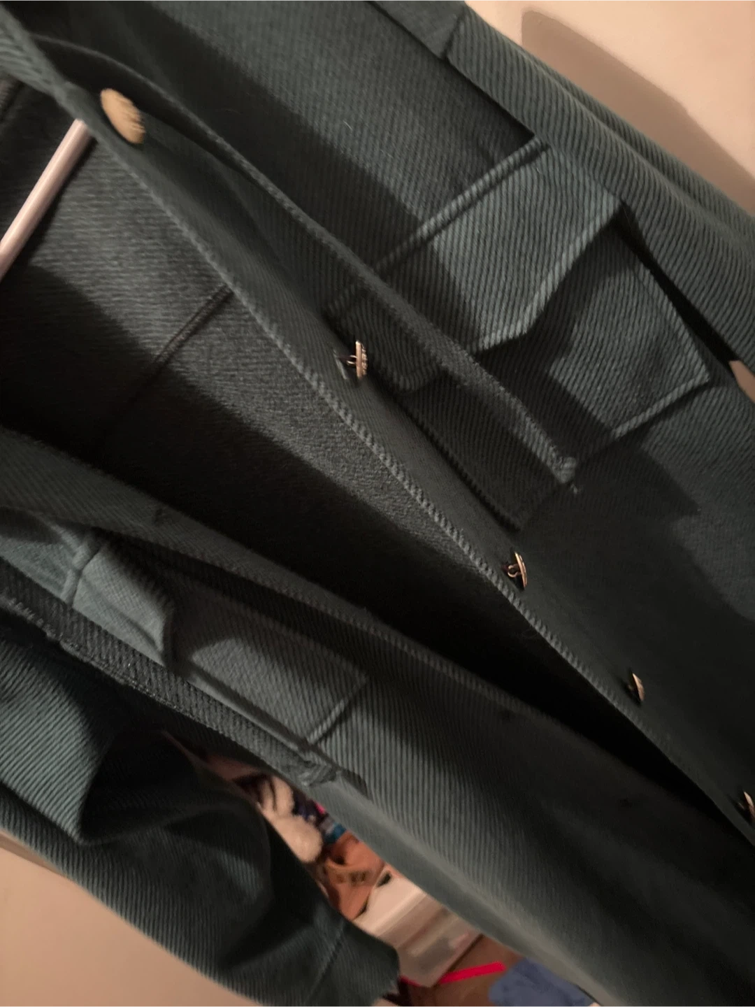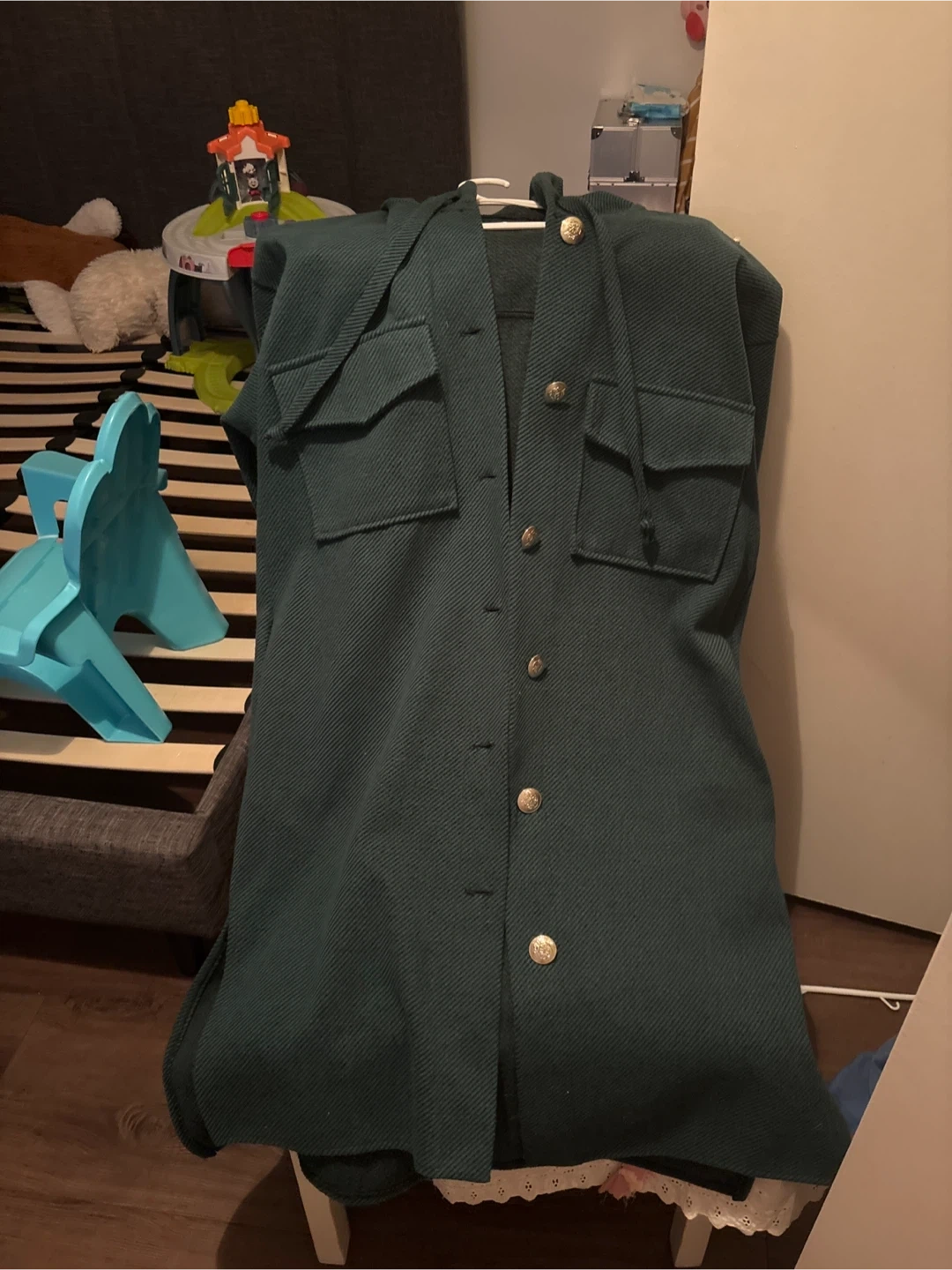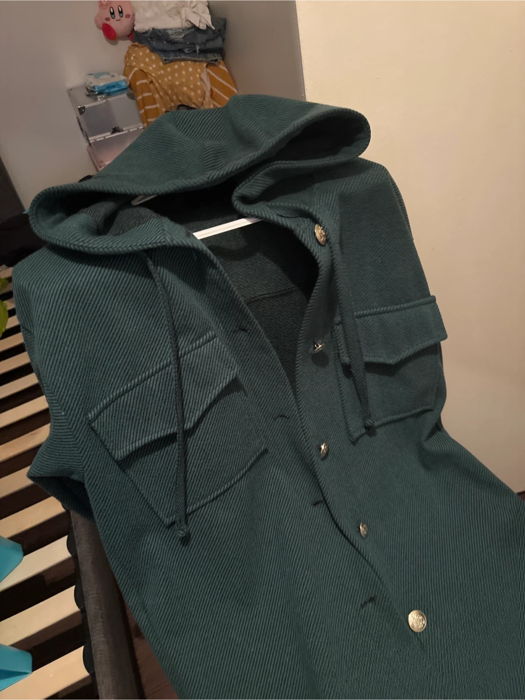 This green jacket features a hood and a button-up front. It has two chest pockets with button flaps. The material appears to be a textured knit. It's a stylish piece for layering.