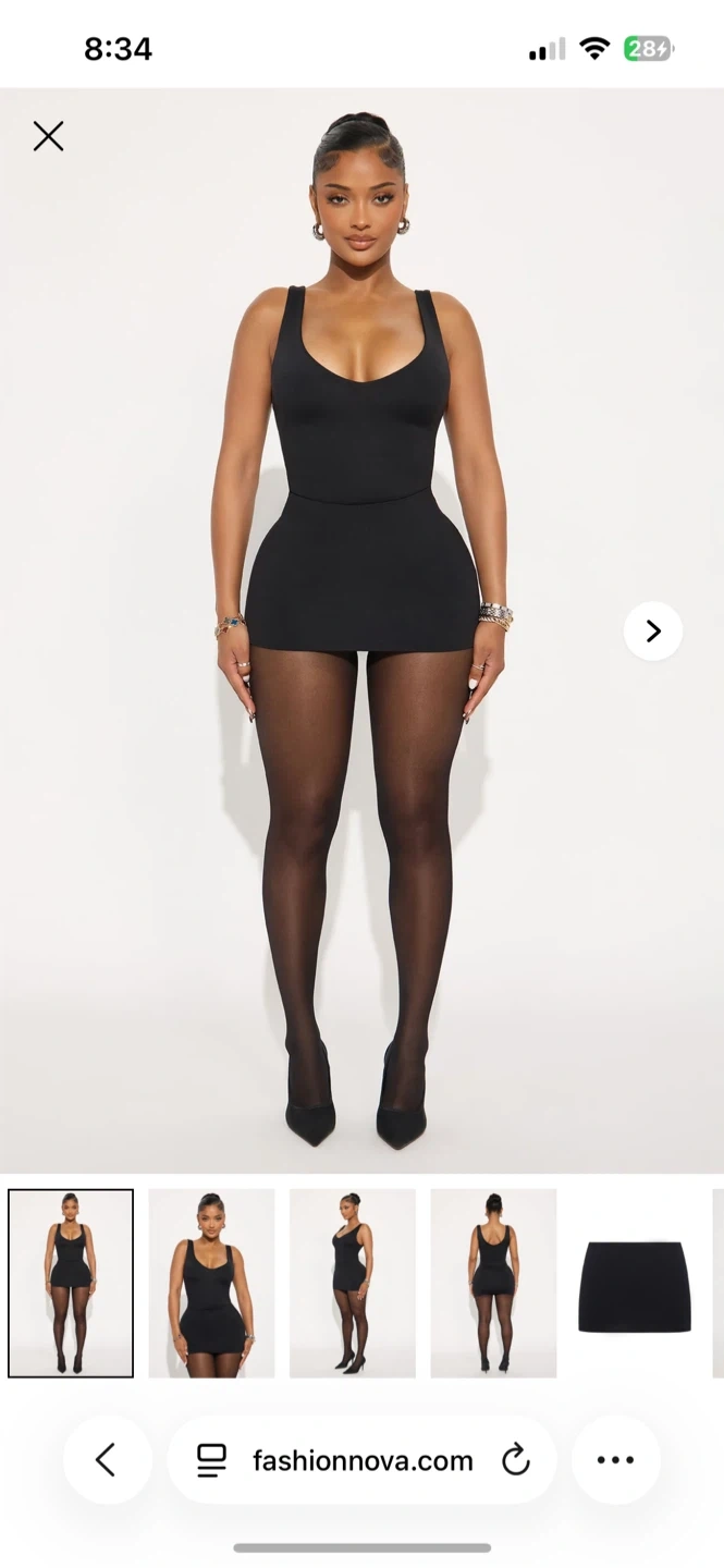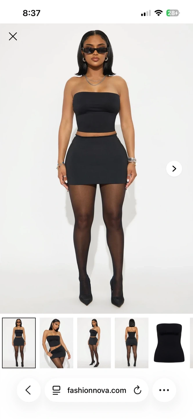This is a black contour mini skirt set with tube top from Fashion Nova. It's made of a stretchy fabric and has a flattering fit. Perfect for a night out or a casual day look!