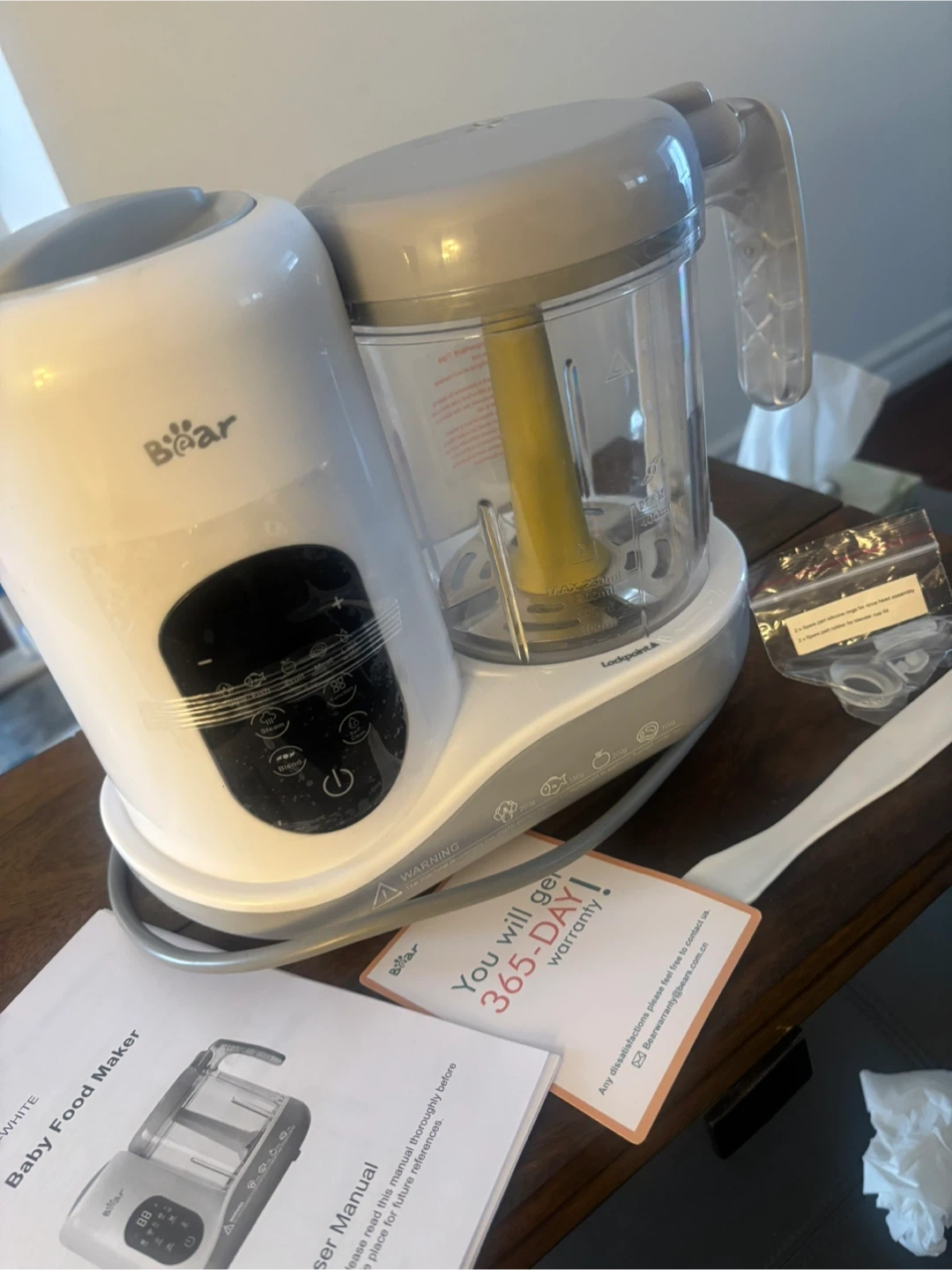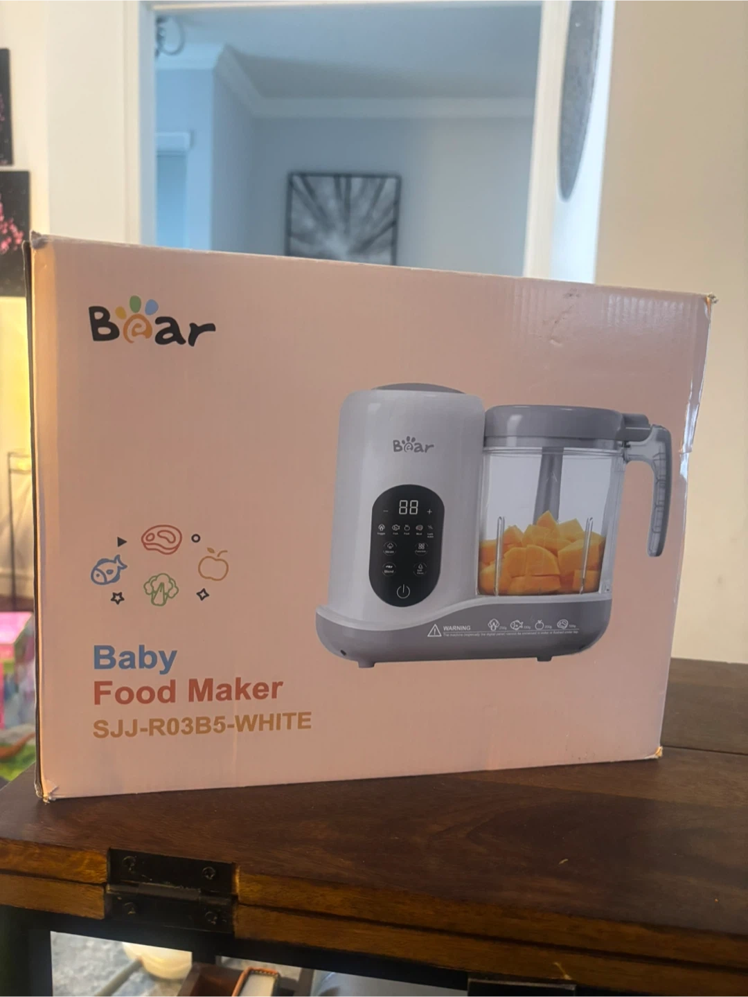 New This Bear Baby Food Maker is white and includes the original box and manual. It's designed to help you prepare healthy meals for your little one. The unit also comes with a 365-day warranty card.