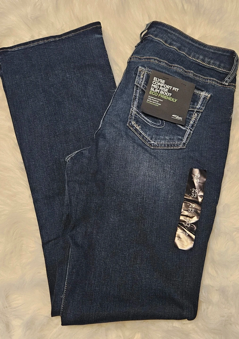 Silver Jeans Co. Elyse bootcut jeans with a comfort fit and mid rise slim boot. These jeans are eco-friendly. Denim material.