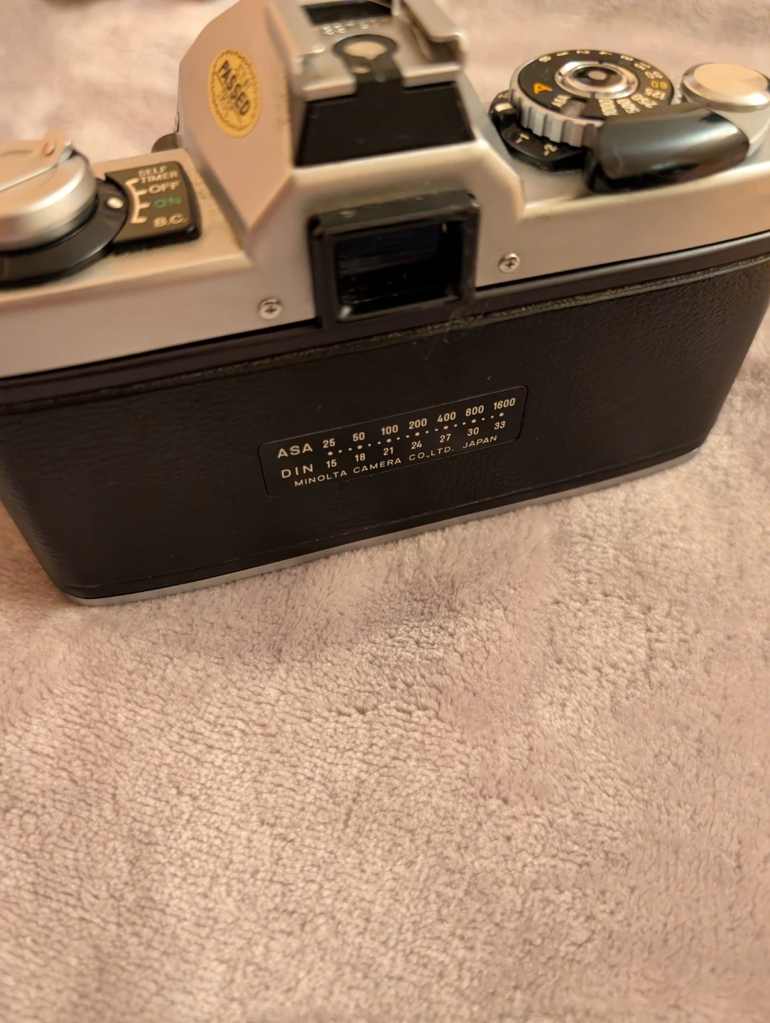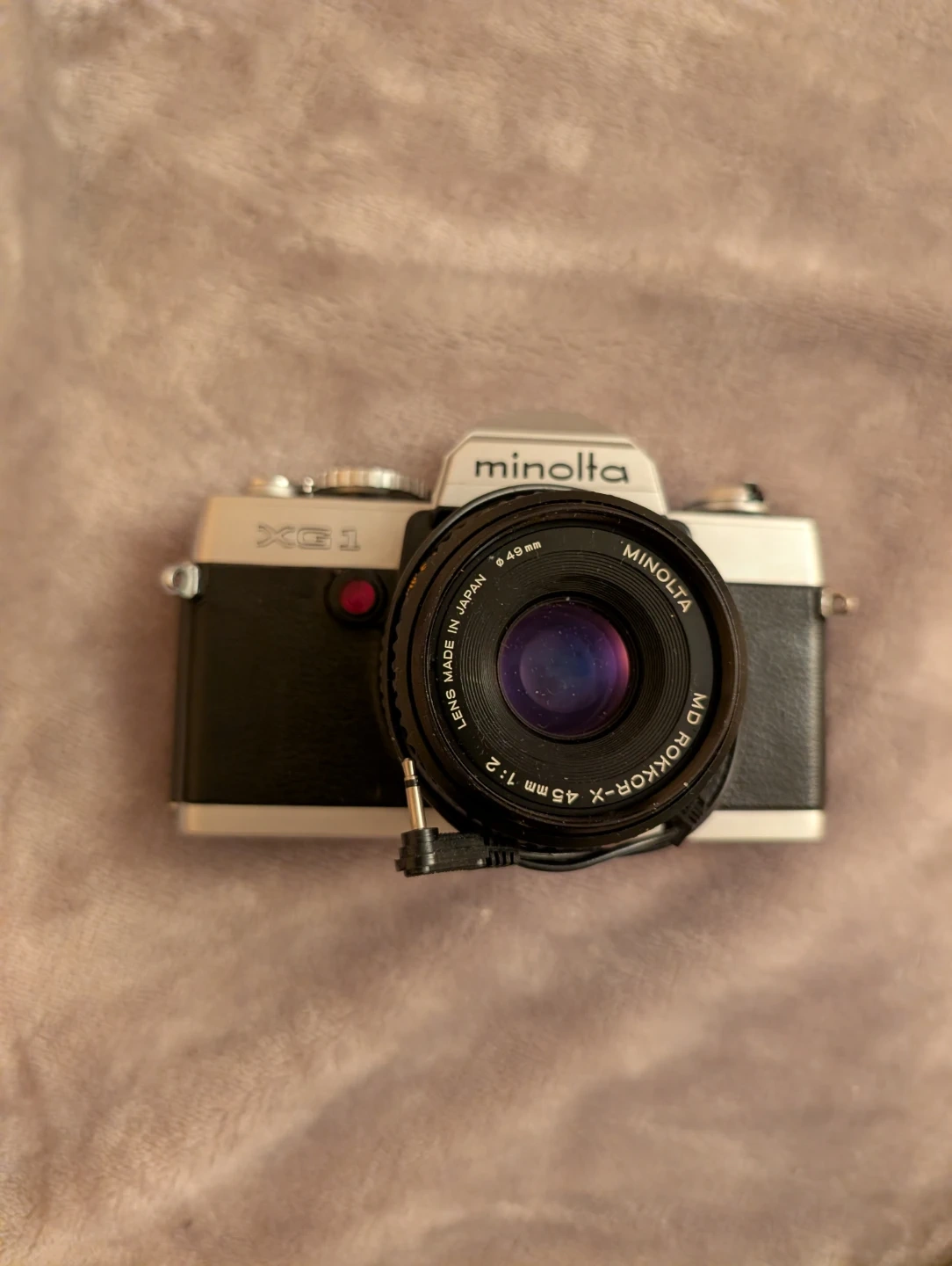 This is a vintage Minolta XG-1 35mm film camera. It's paired with a Minolta MD Rokkor-X 45mm f/2 lens.