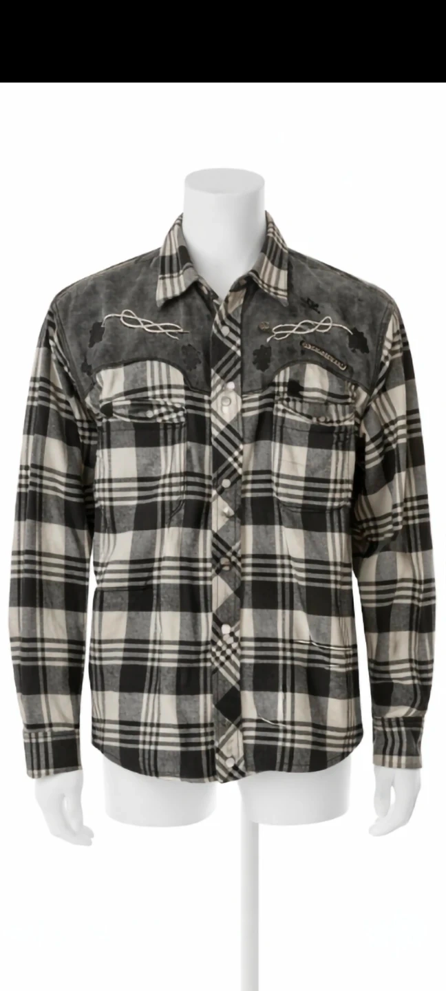 The upper chest and shoulder area feature grey suede or faux-suede panels with decorative details, including a braided rope design on one side and dark star-shaped patches on both sides. It also has front chest pockets that blend into the plaid pattern. (Bottom snap button partially damaged)