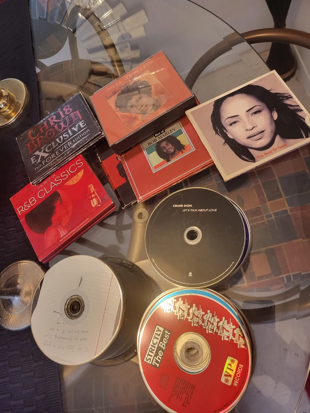 A collection of CDs including R&B Classics, Chris Brown Exclusive, The Best of Sade, Celine Dion's Let's Talk About Love, Bob Marley, Aretha Franklin, and Strictly The Best compilations. Also includes a stack of mixed CDs, Great for any music lover!