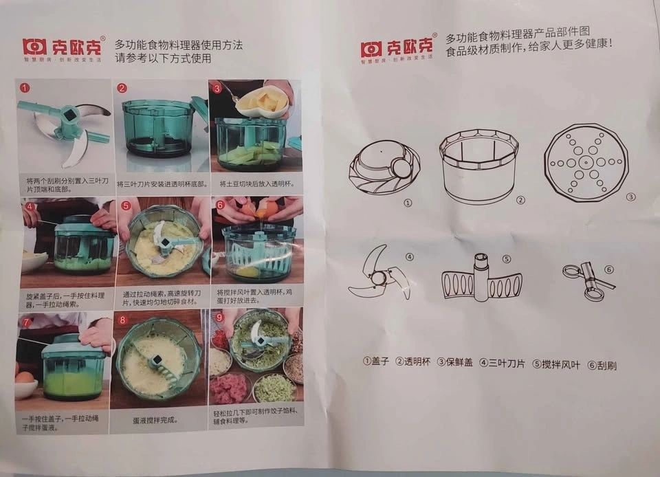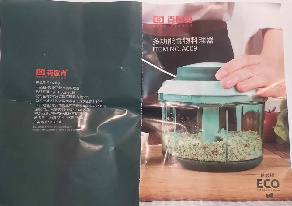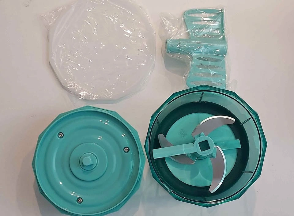 Versatile manual food chopper. Super handy for chopping veggies, making dips, or whisking eggs! Comes with sharp blades, whisk attachment, and a scraper. About 14cm diameter and 13cm tall.