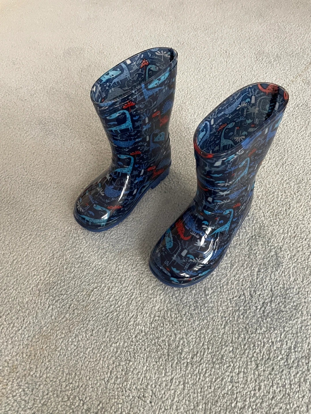 These cute navy blue rain boots have a fun dinosaur pattern. They're made of waterproof material to keep little feet dry. Perfect for puddle jumping!