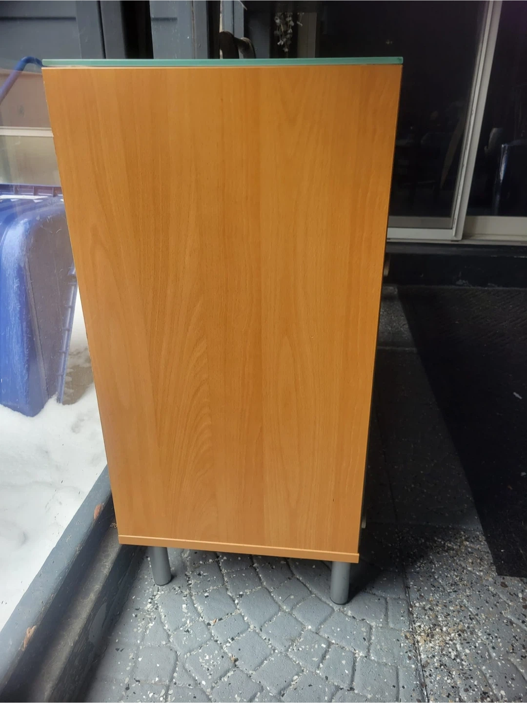 Selling a display cabinet featuring glass doors. It has a wood frame and metal legs. It's in good condition and would be great for displaying your favourite items or storing things neatly!