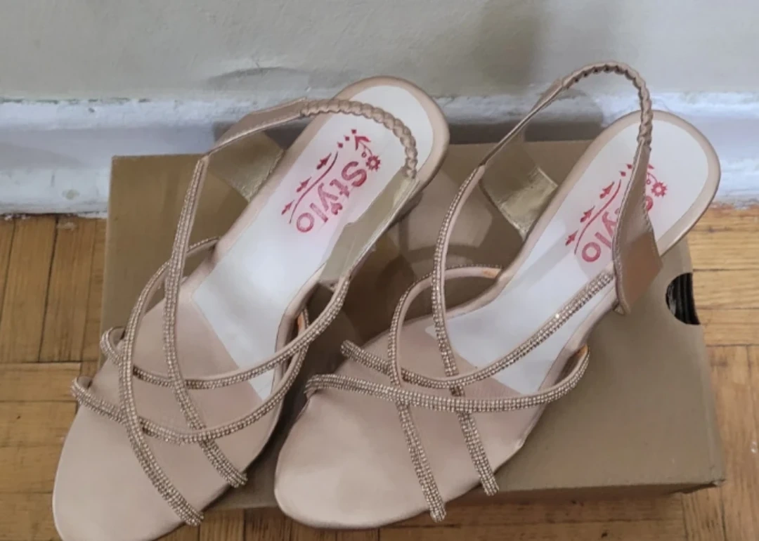 Stylish Stylo sandals in a rose gold hue, featuring delicate embellishments along the straps. These open-toe block heels offer a comfortable lift. Perfect for dressing up any outfit for a night out! Size 3.