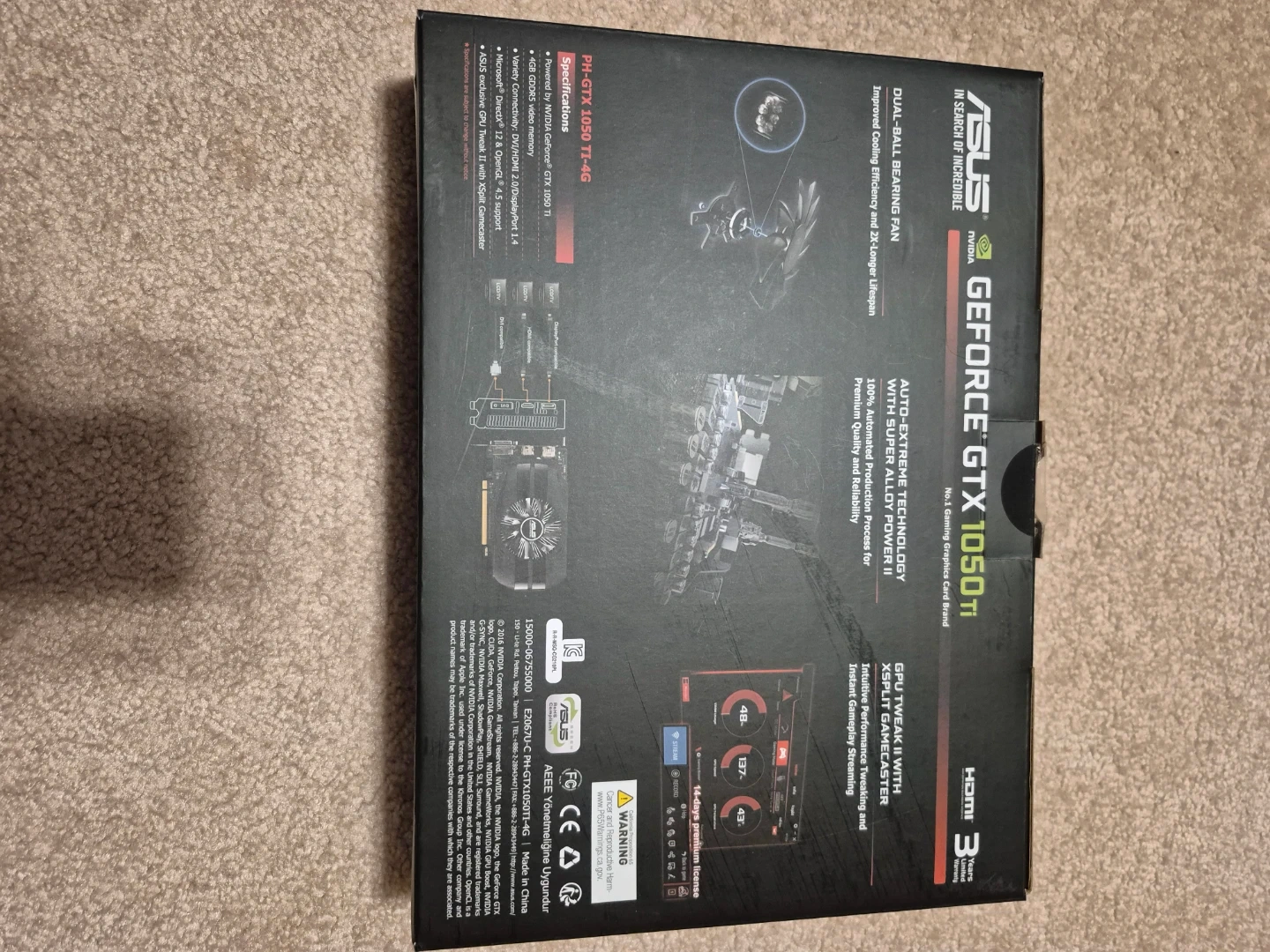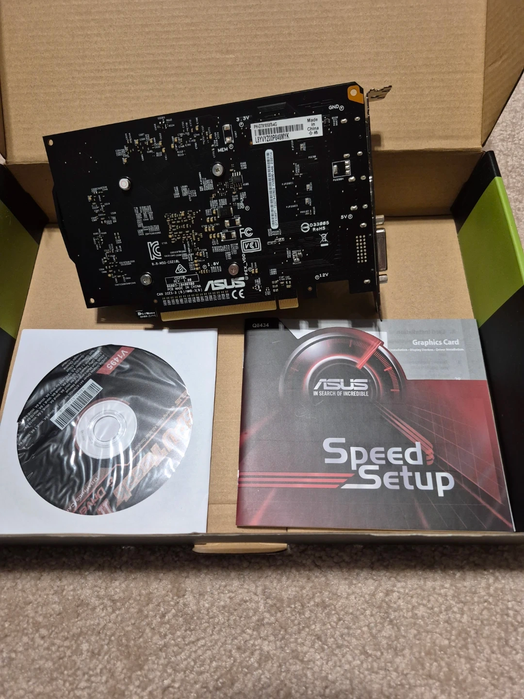 This is an ASUS GeForce GTX 1050 Ti graphics card with 4GB of GDDR5 memory. It features a Dual-Ball Bearing fan for durability. Includes the original box, speed setup guide, and driver CD. It still runs like new but doesn't fit in my new computer.
