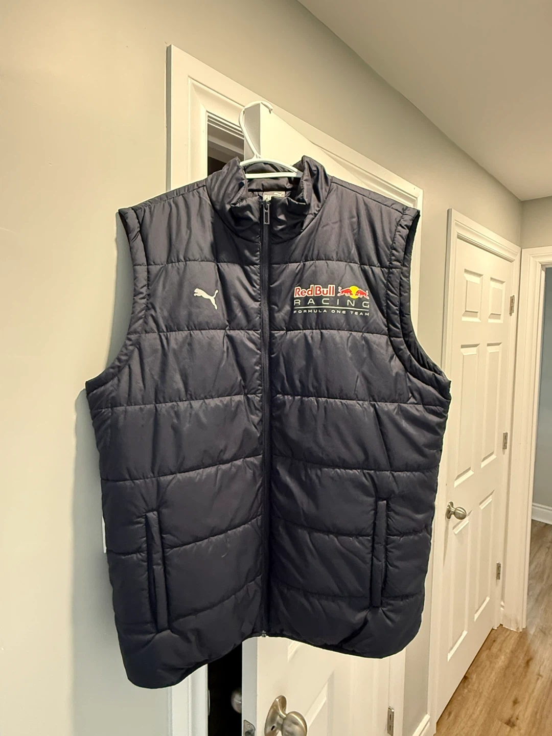 Dark navy puffer vest from Puma, featuring Red Bull Racing branding. Size L. It's a sleeveless design with a full zip closure. Great for a fan!