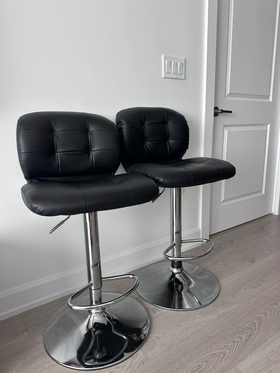 Selling a set of two black bar stools with faux leather upholstery. They feature a chrome base and adjustable height. These stools add a modern touch to any kitchen or bar area!