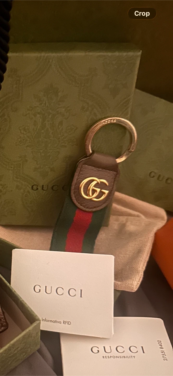 Selling a Gucci key chain that's in great condition! It comes with the original box and packaging. It has the iconic Gucci logo and green/red stripe design.