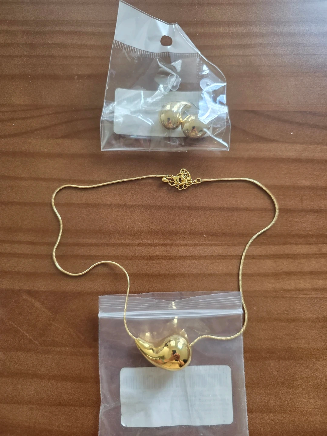 A gold tone necklace with a unique teardrop pendant and matching stud earrings. The snake chain necklace secures with a lobster clasp. Both pieces come in individual plastic bags.