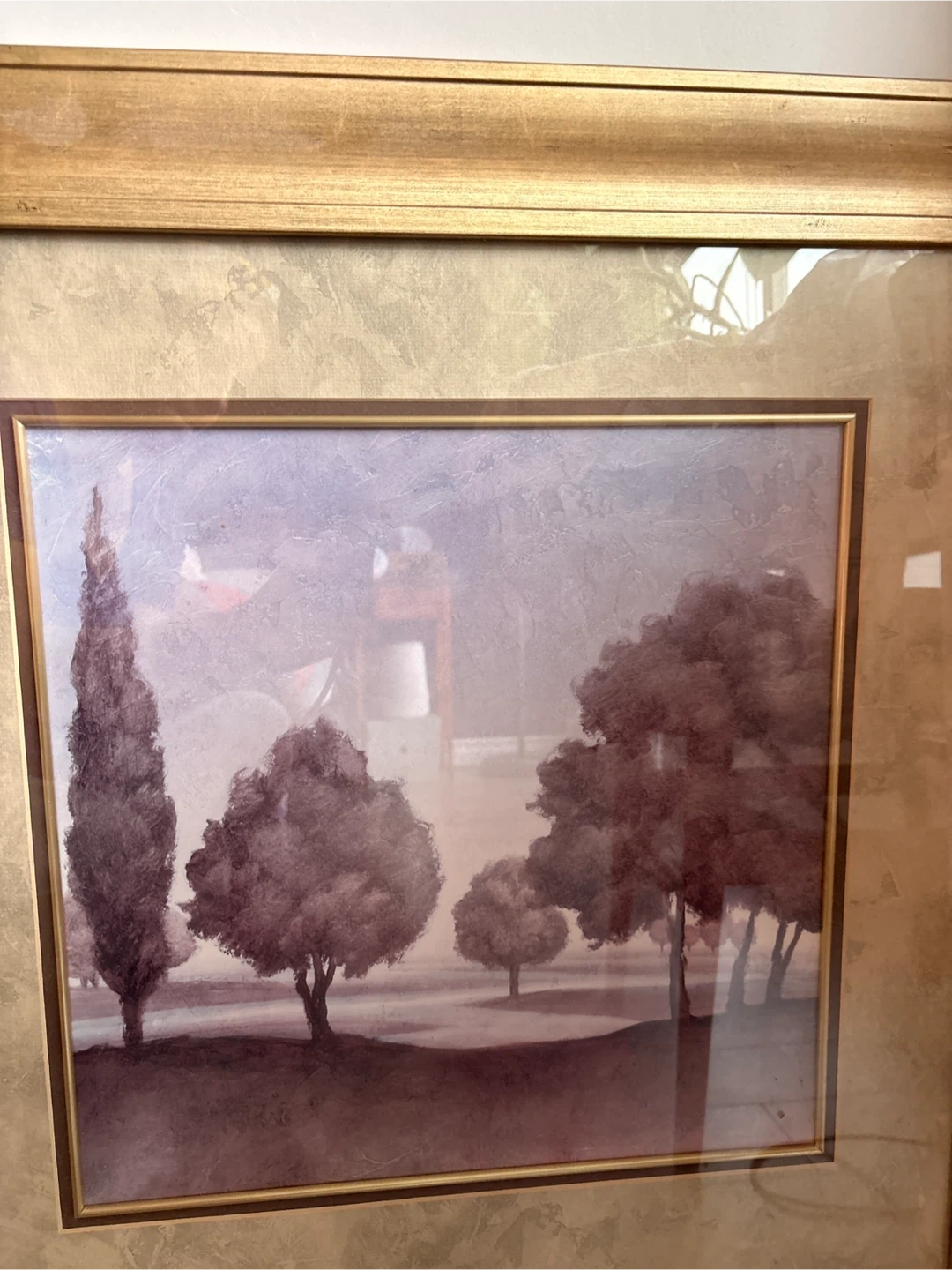 This is a framed landscape painting by Gerard Wall Art. It depicts trees in a serene setting. The frame is a classic gold colour. It's ready to add some charm to your home! dimension 29x29